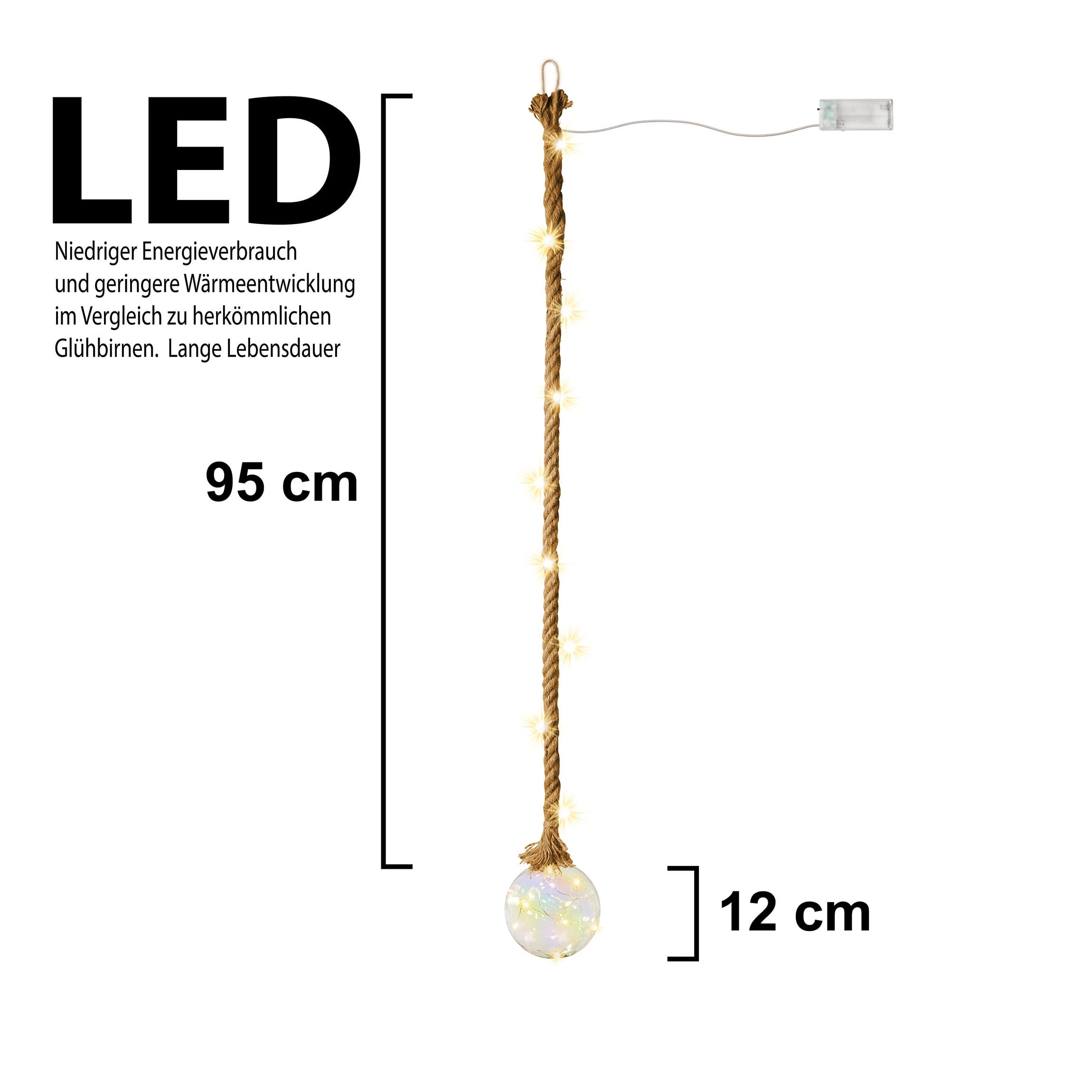 – Verschiedene Größen & Farben: wir bieten die LED-Kugeln am Seil in den Durchmessern 10, 12 & 15 cm sowie als Variante mit Milchglas, Rauchglas, Bernsteinglas & Perlmuttglas an.