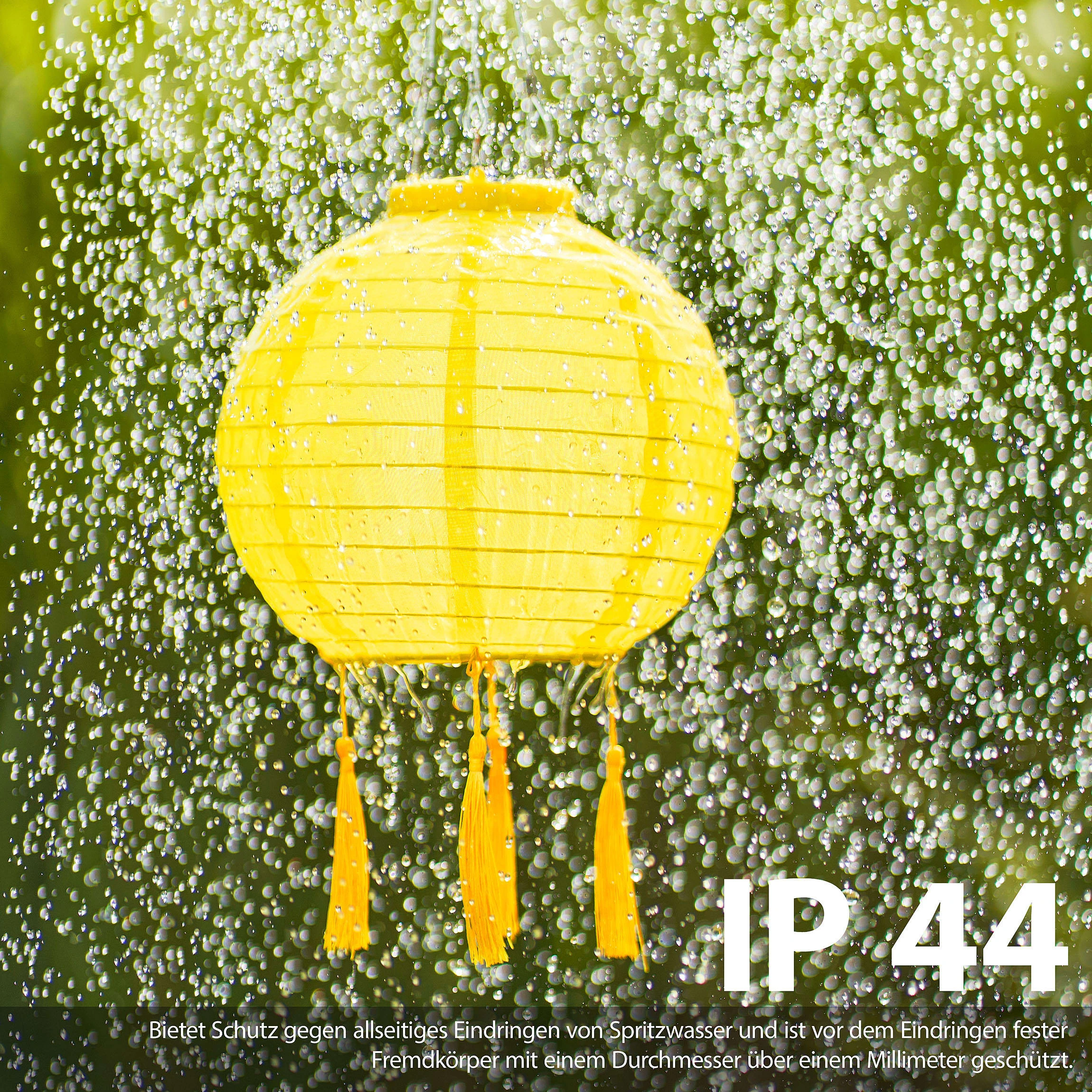 – Durch das eingesetzte Nylon und die IP44 geschütze LED sind die Solar Lampions für den Einsatz im Freien geeignet.