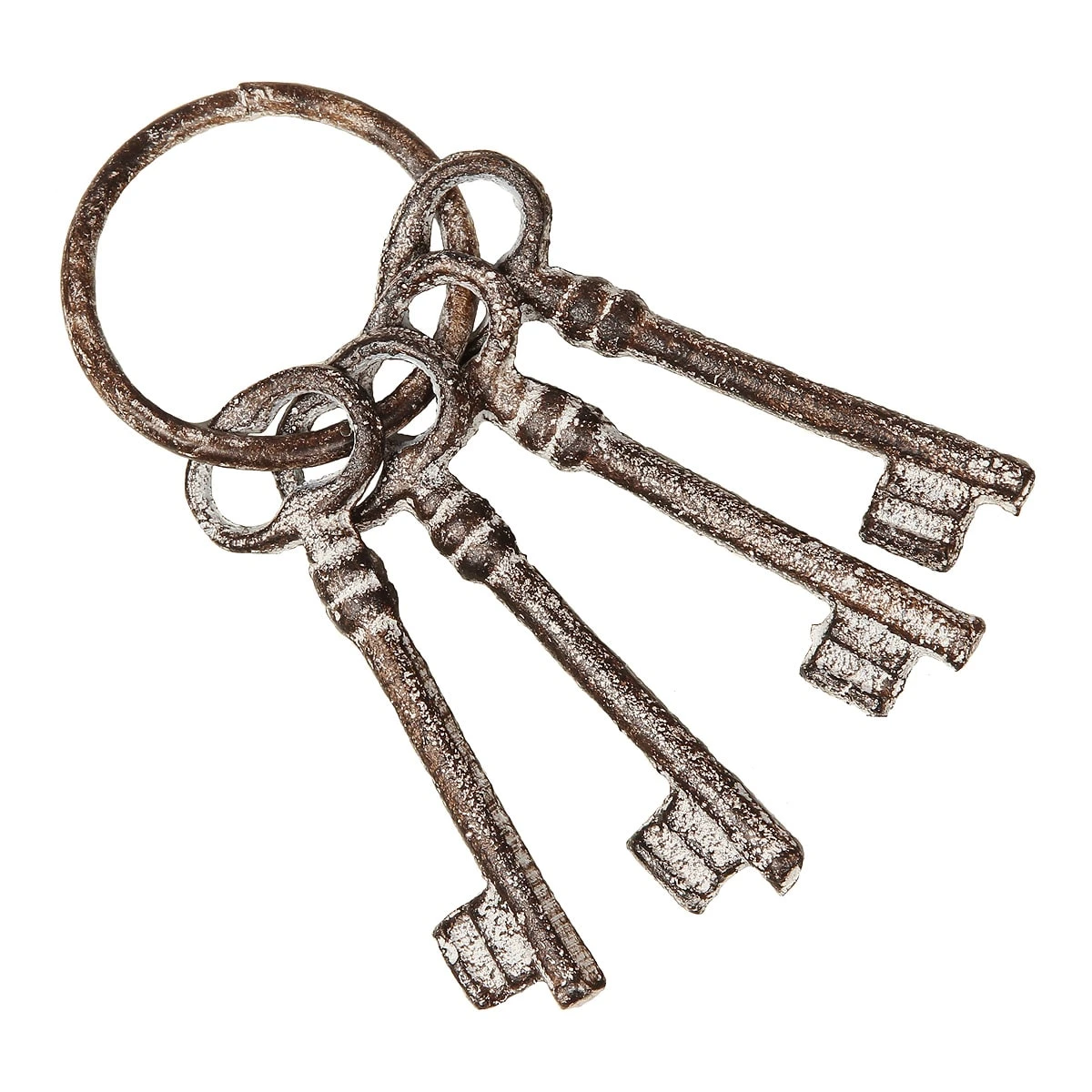 Die vier Schlüssel dieses schönen Schlüsselbundes haben jeweils eine Länge von 9cm. Sie sind an einem soliden Antikeisenring mit einem Durchmesser von 6cm befestigt.