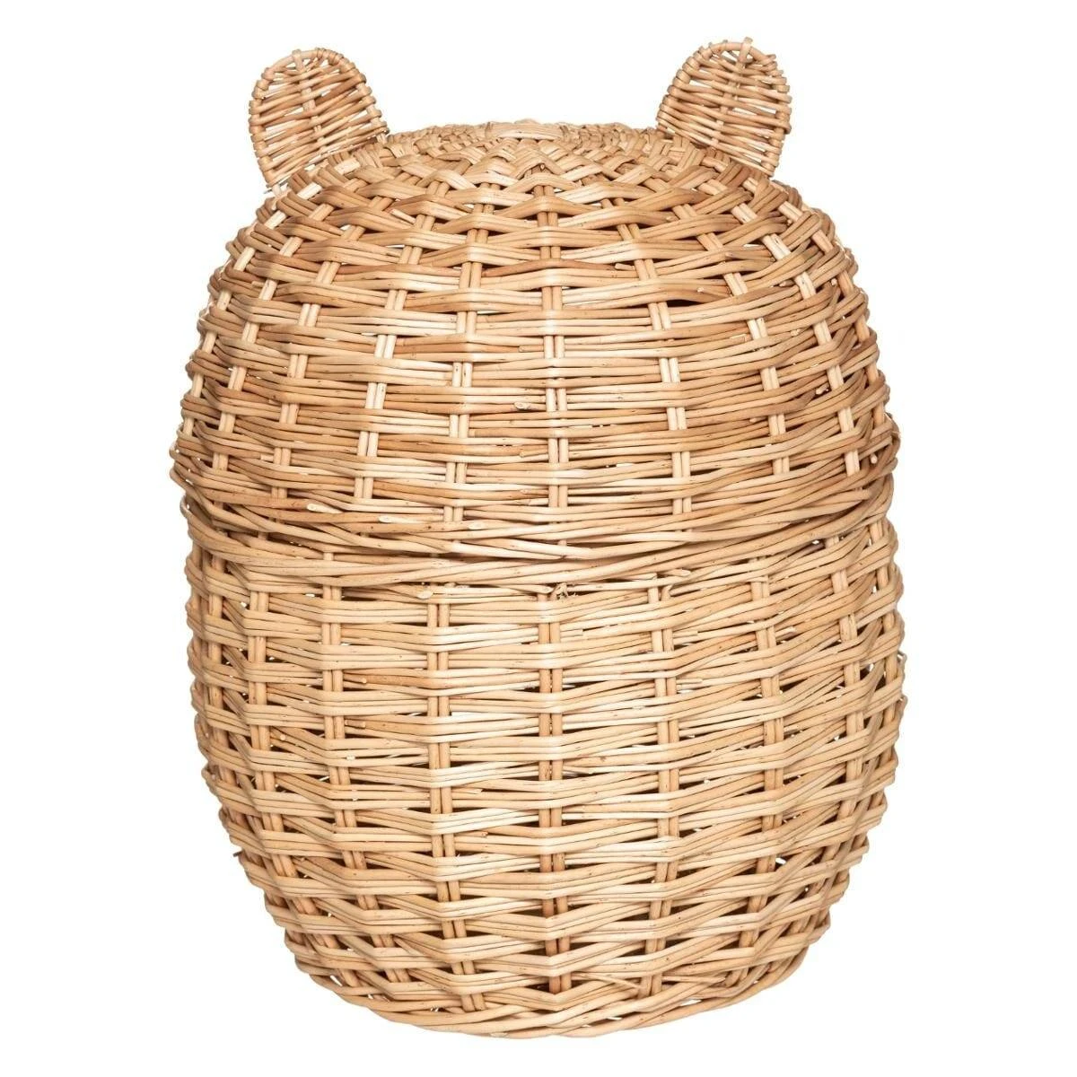 Der Korb ist mit einem Deckel mit süßen Ohren ausgestattet. Dank ihr bleibt das Innere des Korbes unsichtbar. Die natürliche Farbe der Weidenzweige und das sorgfältige Weben machen den Korb selbst zu einem großartigen dekorativen Accessoire.