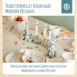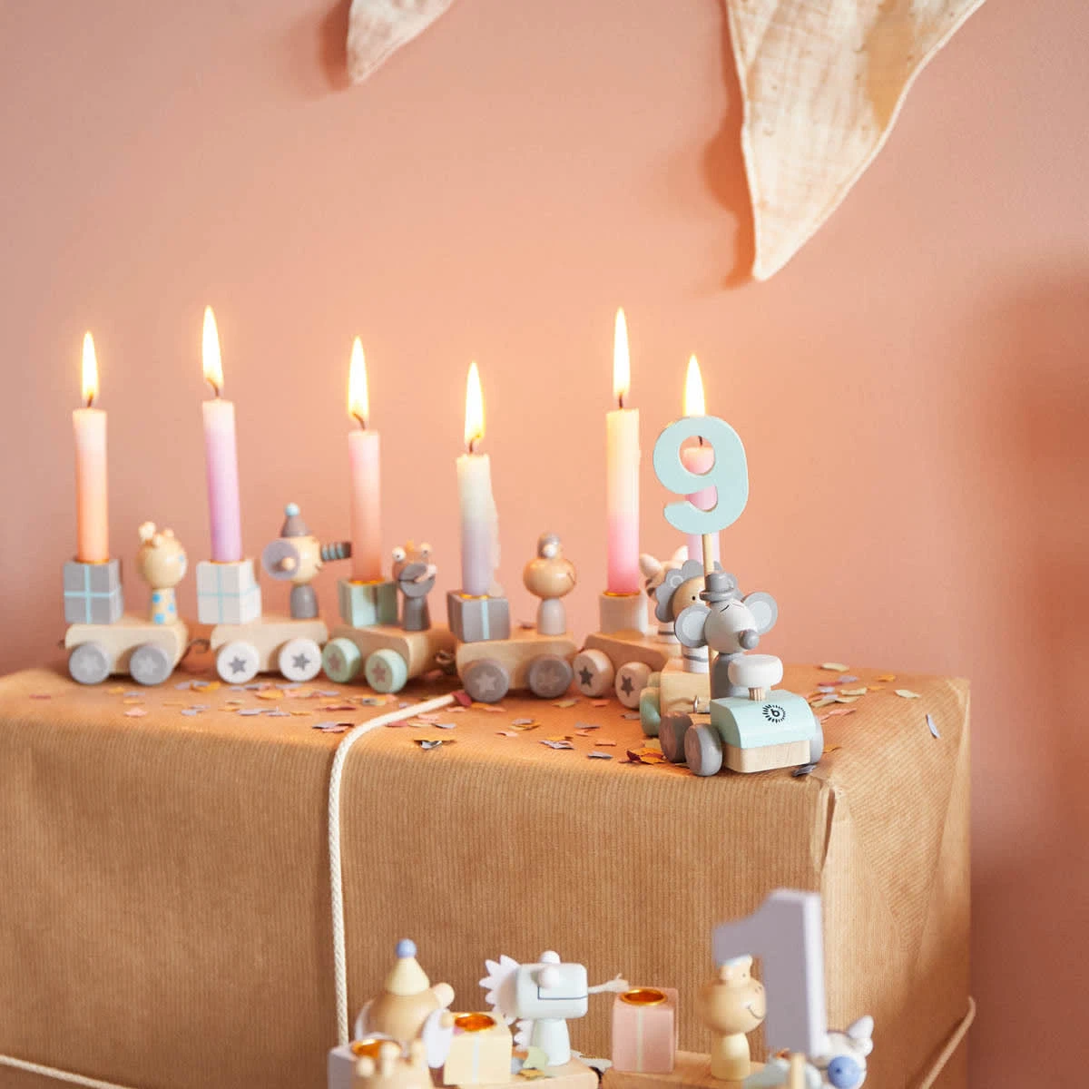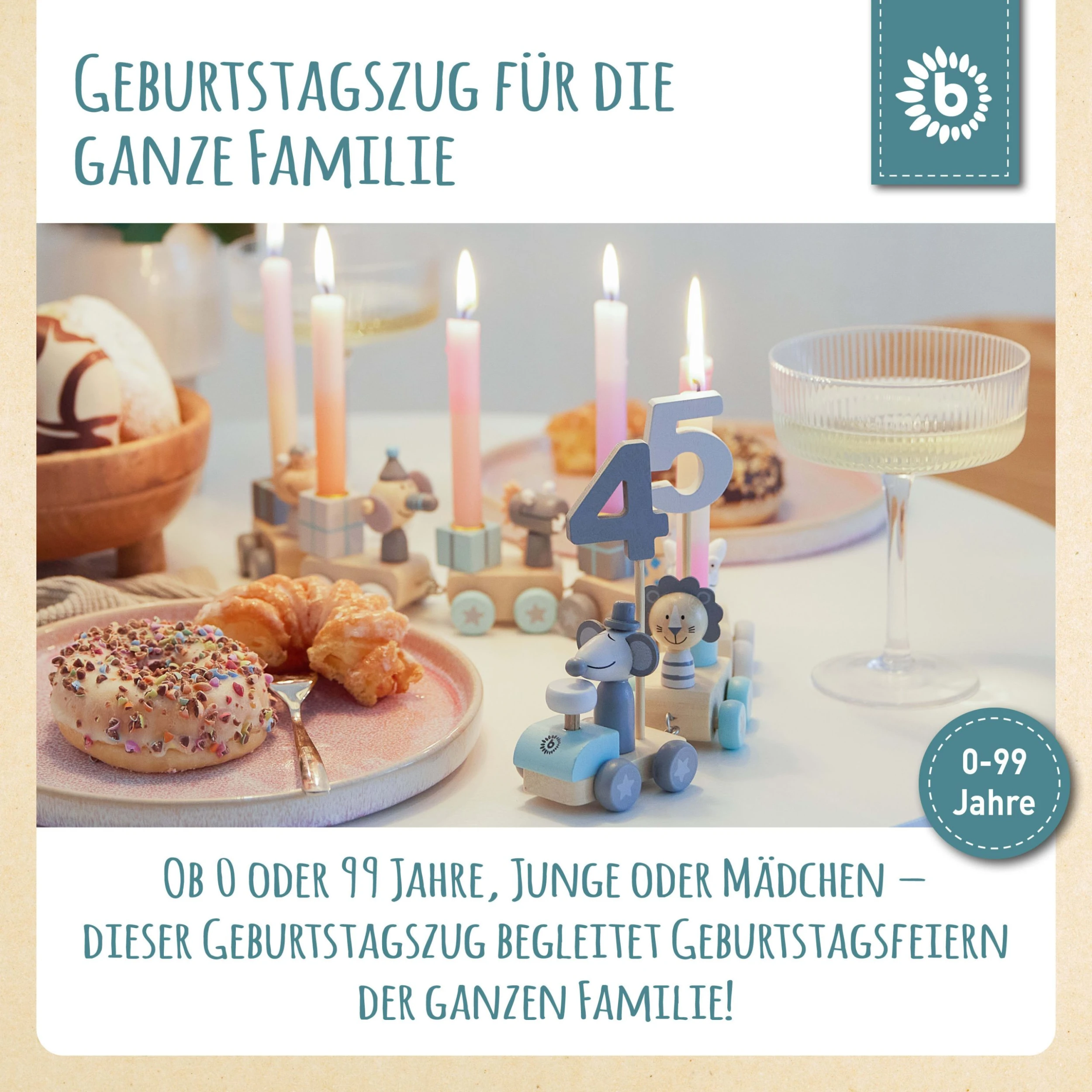 Der schöne Geburtstagszug von Bieco, ist aus Holz gefertigt und die perfekte Ergänzung für jeden Kindergeburtstags Tisch. Der Geburtstagszug Kinder besteht aus einer Lok und 6 Anhängern in niedlicher Tierform. Die einzelnen Elemente lassen sich über Metallösen ineinander hängen und verbinden und sind eine tolle Geburtstagsdeko. Die ersten beiden Wagen sind mit einem Steckplatz für die im Set enthaltenen Zahlen ausgestattet. Jeder Waggon (6x) hat eine Halterung für eine (Standard) Geburtstagskerze. Die Geburtstagskarawane der einzelnen Anhänger kann individuell gewählt werden, mit Ausnahme des ersten Tieres des Zugs (Lok). Der Geburtstags- Zug ist aus Holz gefertigt und besonders hochwertig im harmonisch, modernem Farbdesign. Die Farben sind natürlich speichelfest und schad stofffrei. Mit einer Länge von etwa 48 cm ist er die perfekte Dekoration für jeden Geburtstagstisch und wird Jung sowie Alt viel Freude schenken. Die Marke Bieco steht seit vielen Jahren für höchste Qualität und innovative Produktentwicklung. Unsere Spielwaren für Babys und Kleinkinder unterliegen allesamt den strengsten Richtlinien deutscher Produkt- und Sicherheitsstandards. Bieco möchte Kindergesichter zum Leuchten bringen, deshalb werden alle Designs für unsere Kleinen mit Liebe gefertigt.