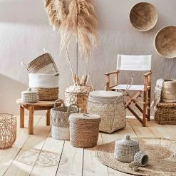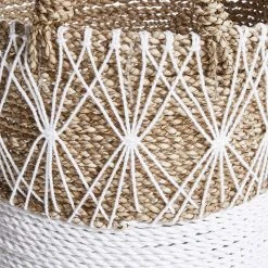 Boho-Stil und Strandfeeling – das macht den Look des White Beach Korbs mit Griffen aus. Er ist aufwändig aus den Naturmaterialien Pandanus und Baumwolle gearbeitet, als weiteres Material kommt Kunststoff hinzu. Seine besondere Optik erhält der Korb durch die Farben Natur und Weiß sowie durch die fein gespannten Fäden, die an Stickereien oder Makramee erinnern. Da suchen Sie doch gleich nach einer leichten Decke oder anderen Sommeraccessoires, die sich dekorativ verstauen lassen. Tipp: Kann auch anstelle eines Übertopfes für Pflanzen verwendet werden. Weitere Größen erhältlich, ideal auch zum Kombinieren.