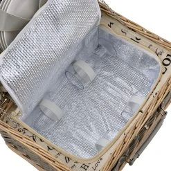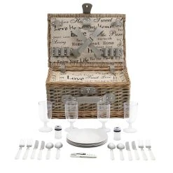 PicknickkorbDer Picknickkorb mit integrierter Kühltasche sorgt für viele schöne Stunden im Grünen. Er ist sehr handlich und mit Geschirr, Gläsern und Besteck ausgestattet.Produktdetails:- Praktischer Picknickkorb für 4 Personen- Mit integrierter Kühltasche- Inkl. Geschirr, Besteck, Korkenzieher, Gläser, Salz- und PfefferstreuerInhalt:- 4 x Keramik-Teller- 4 x Messer- 4 x Gabel- 4 x Löffel- 4 x Kunststoff-Glas- 2 x Salz-/Pfefferstreuer- 1 x KorkenzieherMaterial:- Korb: Weide + Kunstleder (100% Polyurethan)- Innenfutter: 60% Baumwolle / 40% PolyesterMaße (LxBxH):40 x 28 x 19 cmFarbe:Korb: GrauInnenfutter: Brief-DesignLieferumfang:1 x Picknick-KorbMarkenware aus dem Hause:[casa.pro]®