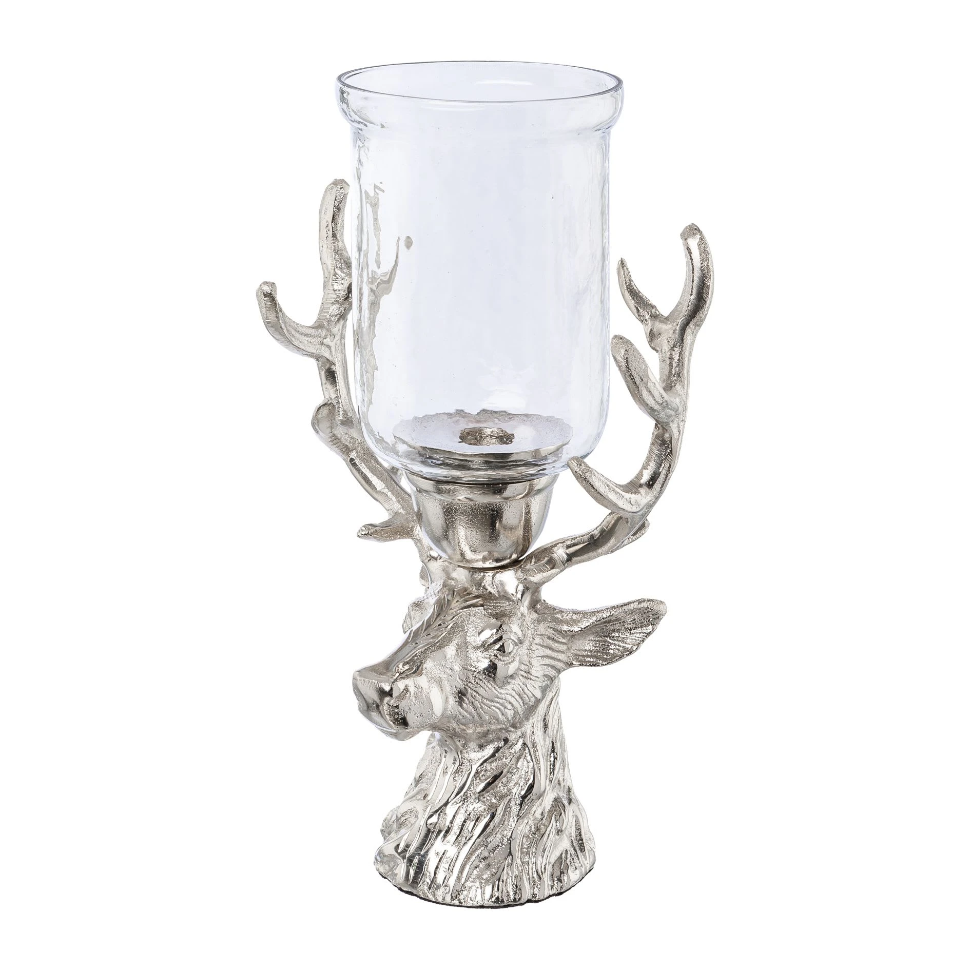 Das Windlicht besteht aus einem detailreich gearbeiteten Hirschkopf aus Aluminium. Zwischen den beiden Geweihästen hält der Hirsch ein großes Windlicht aus Glas, in das Du entweder eine Stumpenkerze oder ein großes Teelicht einsetzen kannst. Ob auf dem Kaminsims, der festlich gedeckten Tafel oder auf einer Säule dekoriert, dieses Windlicht hat eine imposante und gleichzeitig edle Ausstrahlung und wird Geweih-Fans auch außerhalb der Weihnachtszeit viel Freude bereiten. Die Maße des Windlichts betragen 32x17x12cm. Das Glas ist abnehmbar.