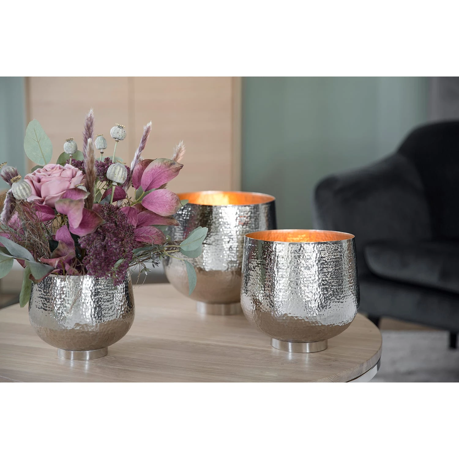 Die Windlichter SELMA kombinieren klare Formen mit individuellem Charakter und bezaubernden Details: Ein goldfarbenes, mattes Finish im Inneren verstärkt den warmen Kerzenschein – für eine behagliche Stimmung in jedem Wohnbereich. Die charakteristische Hammerschlagstruktur der glänzend veredelten Metalloberfläche ist das Ergebnis von sorgfältiger Handarbeit. Kleine Unregelmäßigkeiten in Form, Oberfläche oder anderen Details entstehen während dieses handwerklichen Fertigungsprozesses. Sie verleihen jedem Artikel einen individuellen Charme und machen jedes einzelne Stück zu einem unverwechselbaren Unikat. Ein origineller Fuß sorgt für einen soliden Stand. Das Windlicht steht in drei Größen für Sie zur Auswahl.