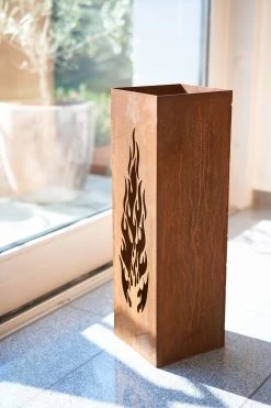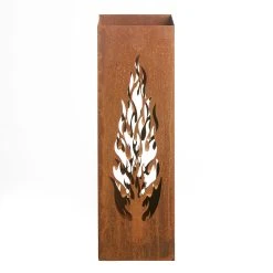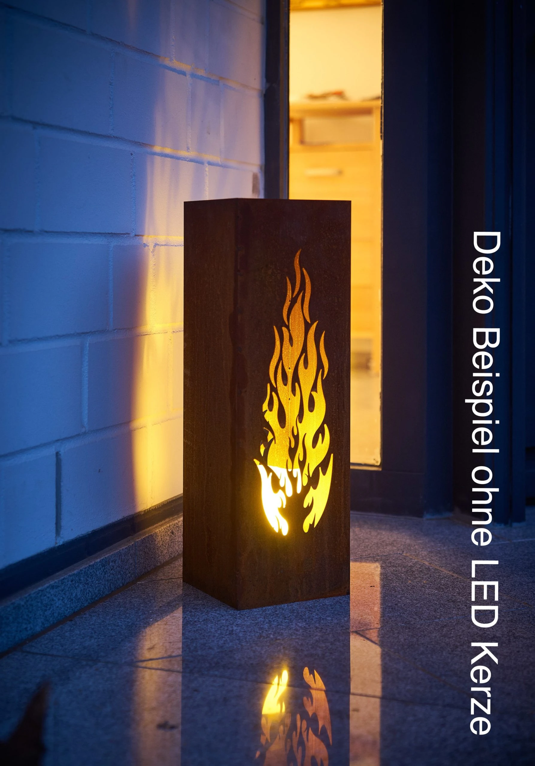 Vielseitiges Deko Highlight!Rund ums Jahr ein wunderbarer Blickfang für den Innen- und Außenbereich! Die Dekosäule in trendiger Edelrost-Optik ziert ein kunstvolles Flammen-Motiv.Bereits tagsüber ist die Dekosäule ein dekorativer Blickfang für Terrasse, Balkon oder Wohnzimmer – am Abend entfaltet sie eine weitere Pracht. Durch eine LED Kerze (separat erhältlich) kann die Dekosäule erleuchtet werden.Das stimmungsvolle Licht strahlt durch das Flammendesign und verbreitet eine stimmungsvolle Atmosphäre.Zusätzlich können Sie einen Pflanzschalen- / Feuerschalenaufsatz mit der Artikelnummer: 9500-1004-02 separat erwerben.Die Pflanzschale ist offen für viele Ideen: zum Bepflanzen und für kreative Deko-Arrangements oder Feuer (nur im Außenbereich), ganz nach Lust und Laune und passend zur Jahreszeit.• Edelrost-Finish• Eckige Säule, auf zwei Seiten mit kunstvoller Flammen-Ausstanzung • passend zur separat erhältichen Gartenfreude Pflanzschale (Artikelnummer: 9500-1004-02) • Outdoor geeignet • Maße: Säule 16 x 16 x 50 cm• Bitte sorgen Sie für eine geeignete Unterlage, da es naturgemäß bei Edelrost zu Abfärbungen kommt