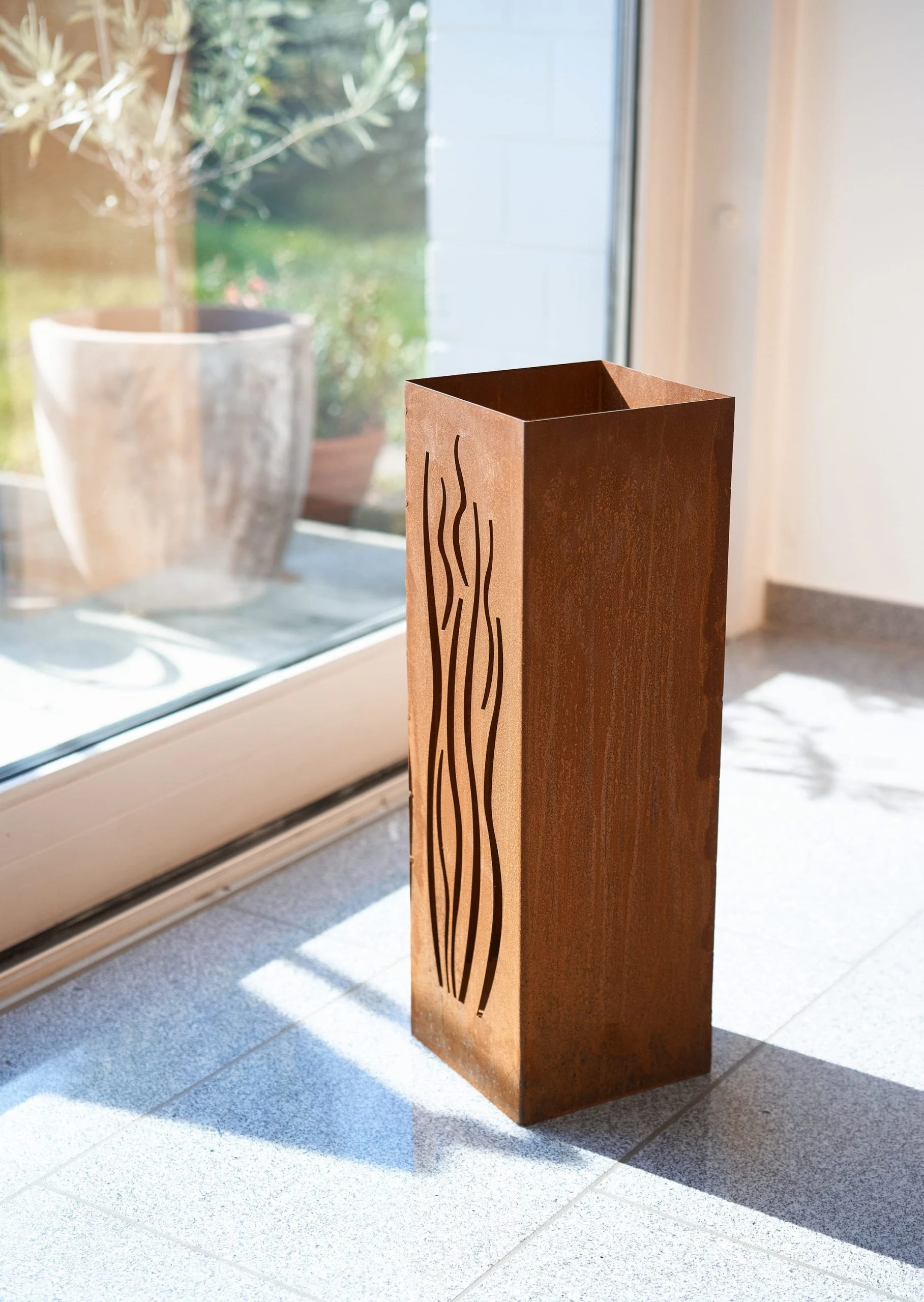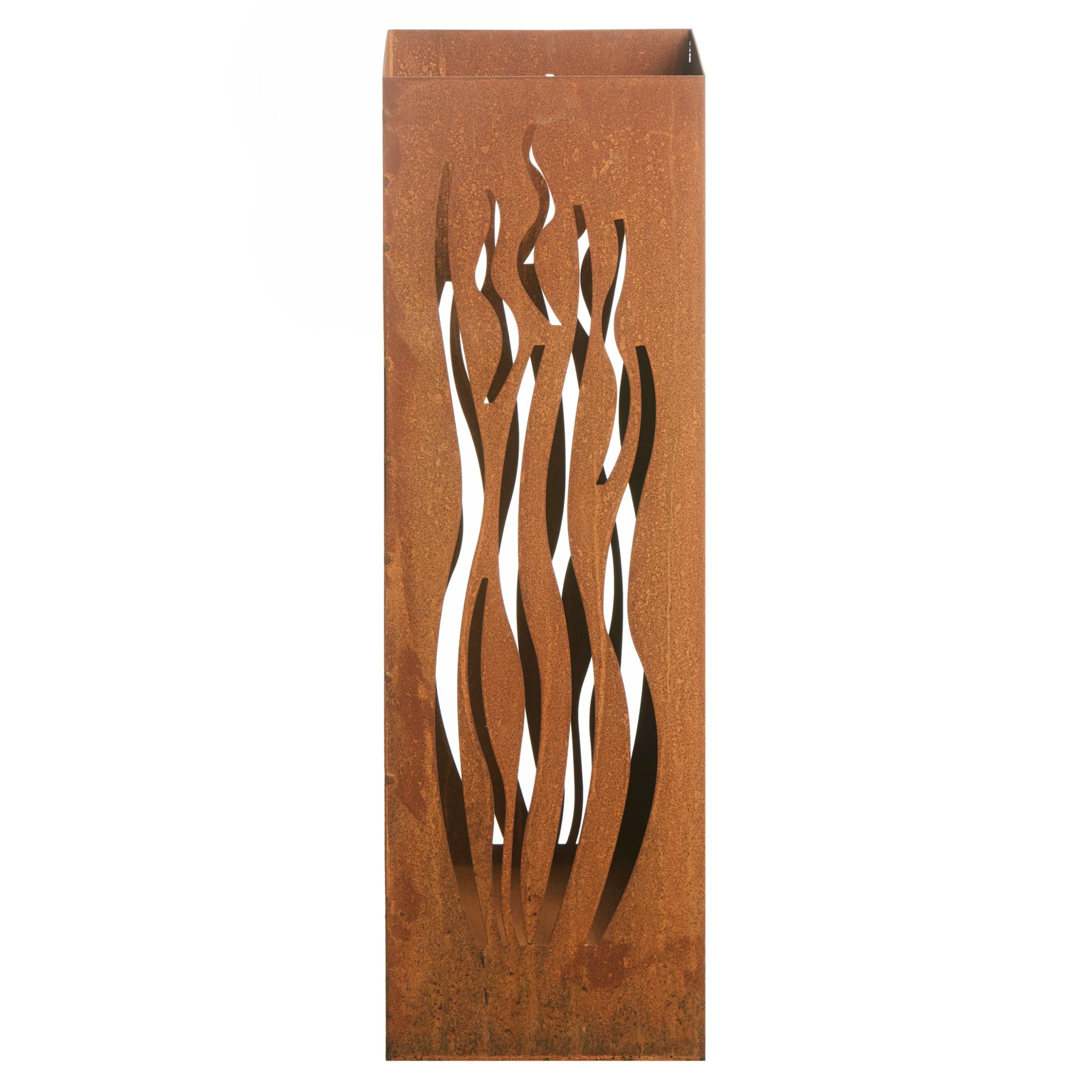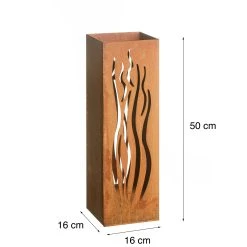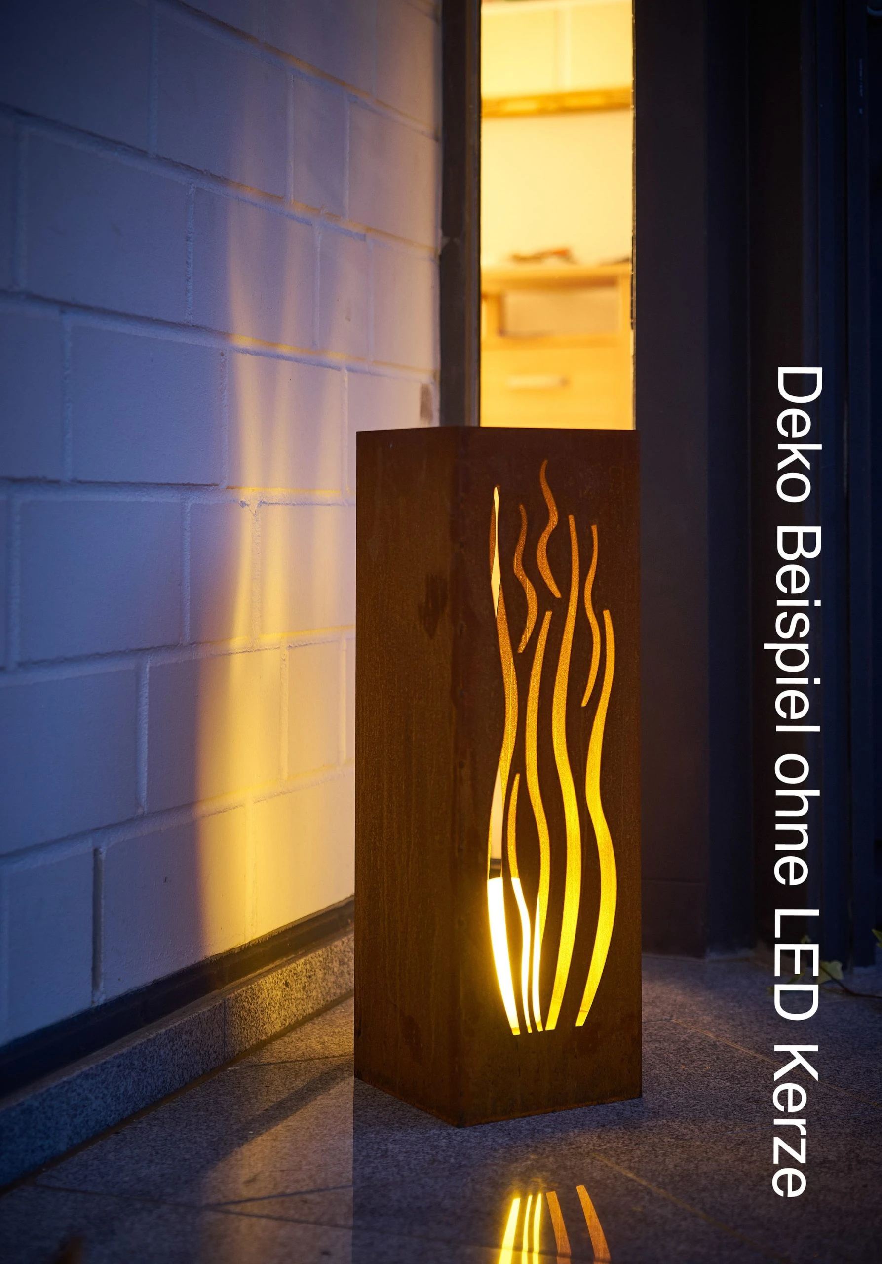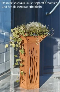 Vielseitiges Deko Highlight!Rund ums Jahr ein wunderbarer Blickfang für den Innen- und Außenbereich! Die Dekosäule in trendiger Edelrost-Optik ziert ein kunstvolles Wellen-Motiv.Bereits tagsüber ist die Dekosäule ein dekorativer Blickfang für Terrasse, Balkon oder Wohnzimmer – am Abend entfaltet sie eine weitere Pracht. Durch eine LED Kerze (separat erhältlich) kann die Dekosäule erleuchtet werden.Das stimmungsvolle Licht strahlt durch das Flammendesign und verbreitet eine stimmungsvolle Atmosphäre.Zusätzlich können Sie einen Pflanzschalen- / Feuerschalenaufsatz mit der Artikelnummer: 9500-1004-02 separat erwerben.Die Pflanzschale ist offen für viele Ideen: zum Bepflanzen und für kreative Deko-Arrangements oder Feuer (nur im Außenbereich), ganz nach Lust und Laune und passend zur Jahreszeit.• Edelrost-Finish• Eckige Säule, auf zwei Seiten mit kunstvoller Flammen-Ausstanzung • passend zur separat erhältichen Gartenfreude Pflanzschale (Artikelnummer: 9500-1004-02) • Outdoor geeignet • Maße: Säule 16 x 16 x 50 cm• Bitte sorgen Sie für eine geeignete Unterlage, da es naturgemäß bei Edelrost zu Abfärbungen kommt