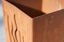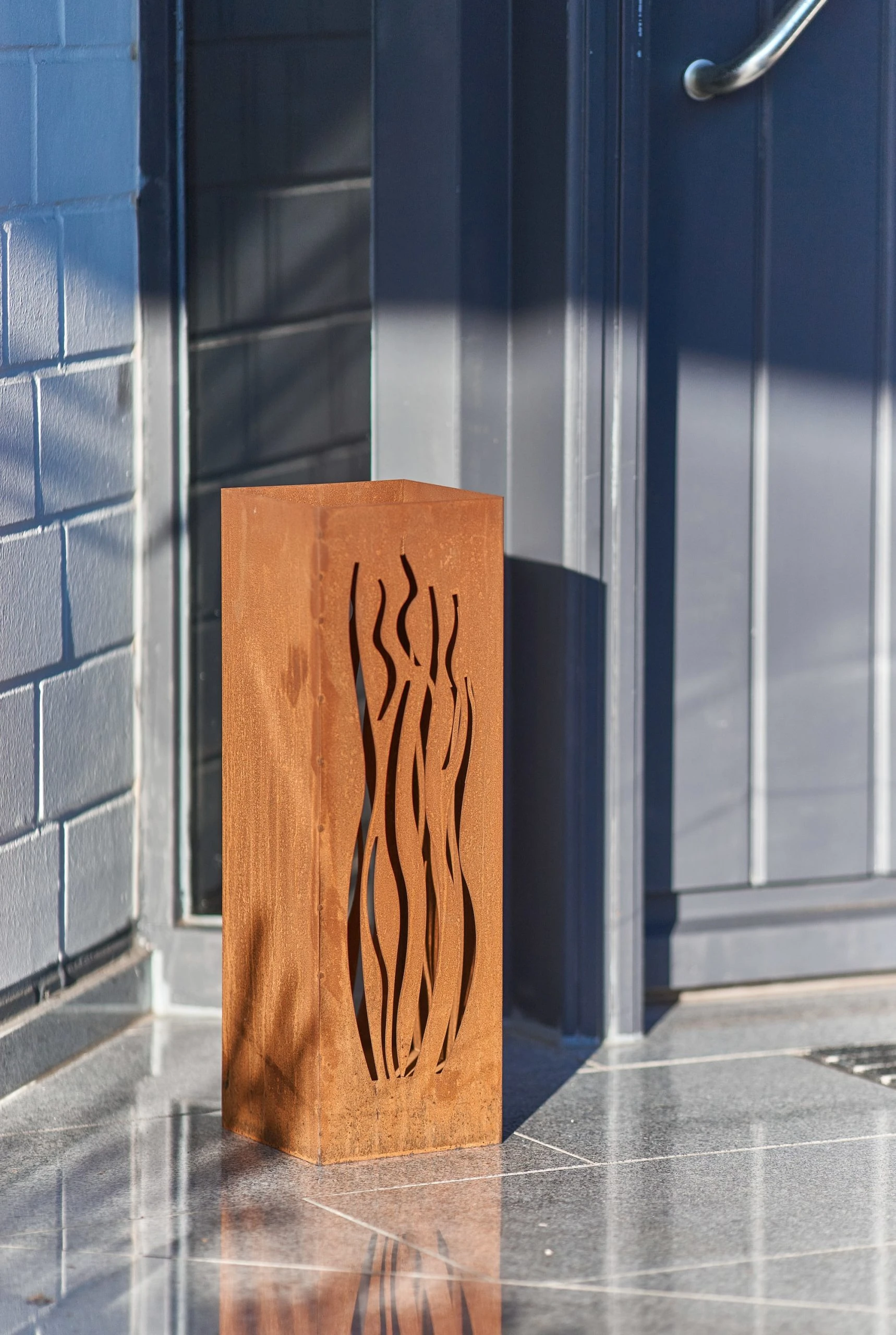 – Die Dekosäule mit kunstvollem Flammen-Motiv wurde im Edelrost Verfahren hergestellt (geeignete Unterlage verwenden, da es naturgemäß bei Edelrost zu Abfärbungen kommt)
