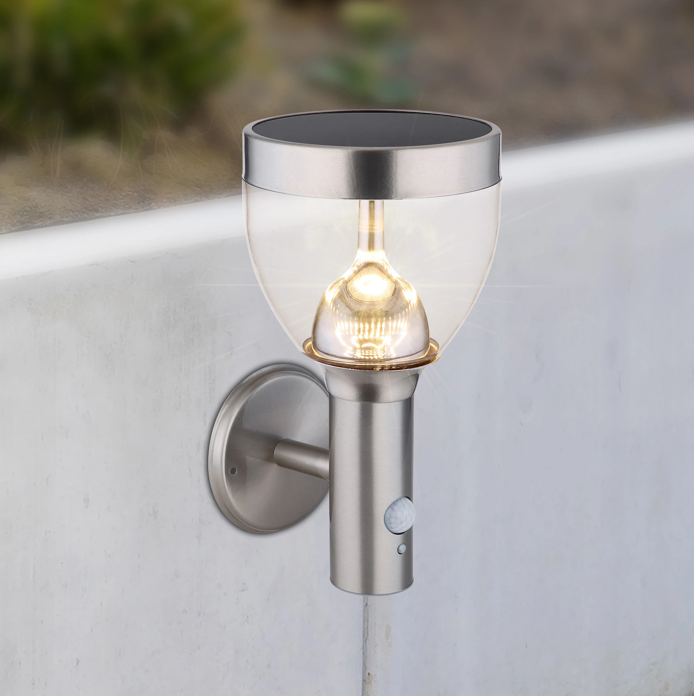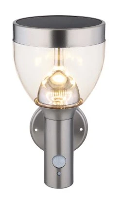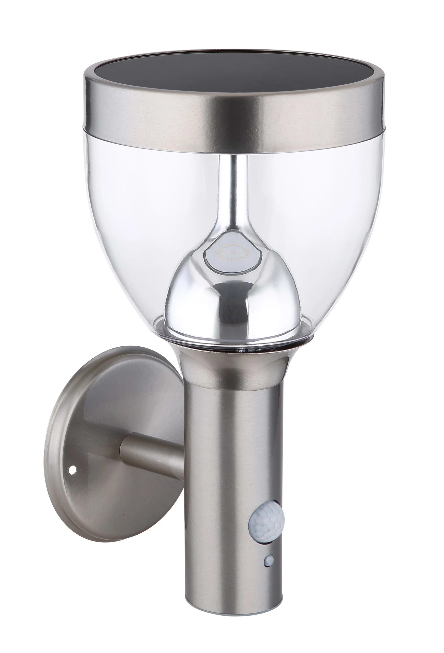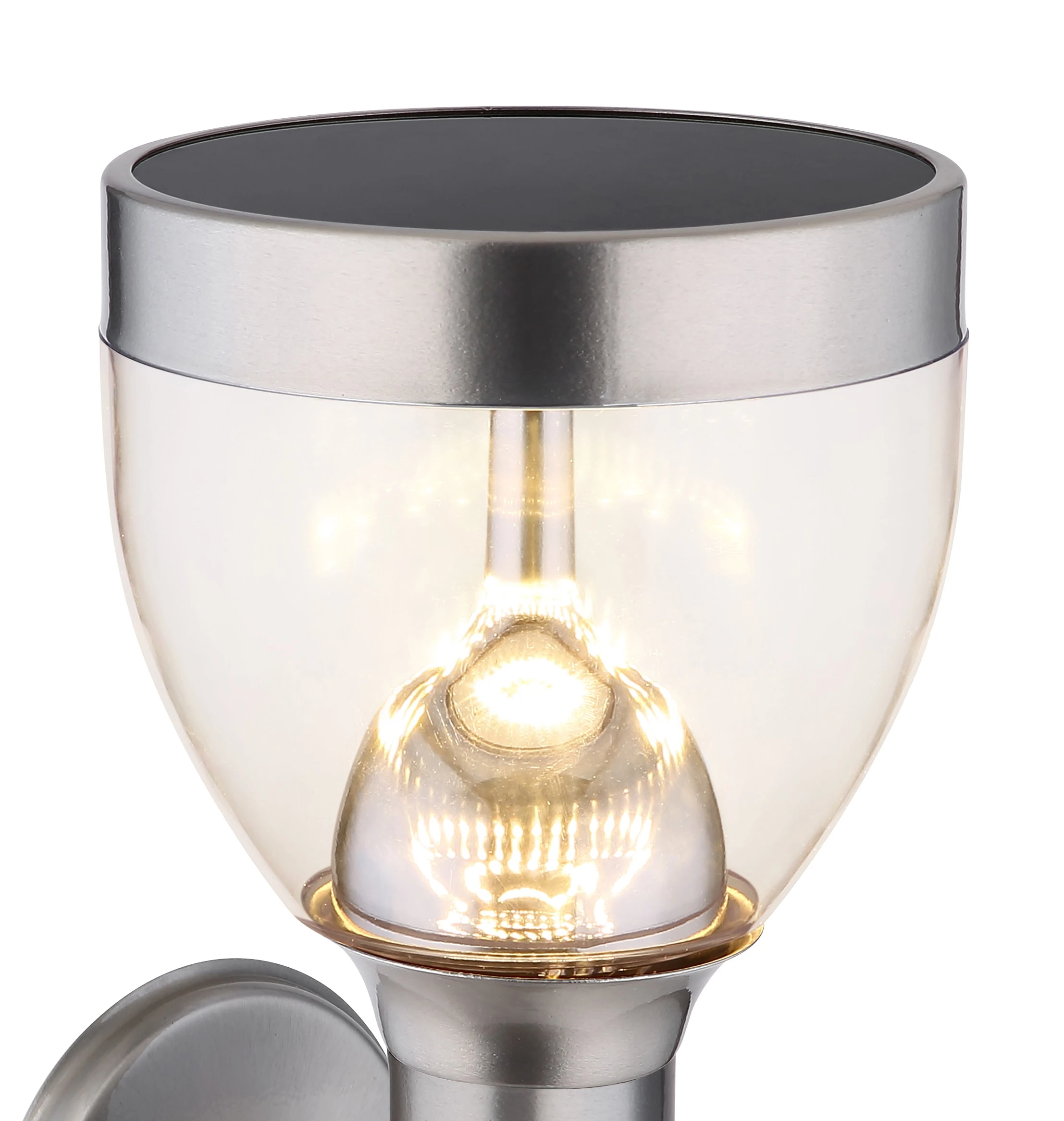 Solarleuchte Edelstahl, Kunststoff grau, Kunststoff klar, Akku inkludiert CR18650 2200mAh 3.7V, Sensor inkl., IP44, 3 Sensoreinstellungen: 70-350-550lm, BxH: 150x280mm, AL: 175mm, inkl. LED 6W 3.7V, 600lm Source, 550lm Output, 3000K, weiß