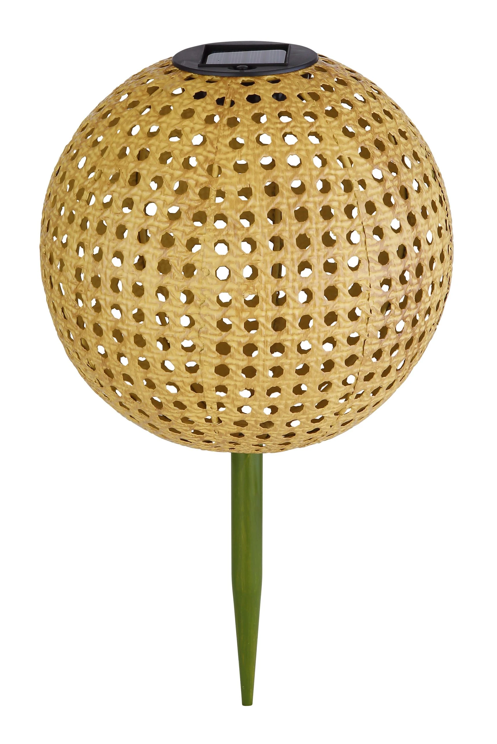Solarleuchte Metall braun, Bambus braun, Druckschalter, Akku inkludiert AA 600mAh 1.2V, IP44, Kugel in Bambusoptik mit Erdspitz, ø: 200mm, H: 345mm, inkl. LED 0.06W 3V, 3000K