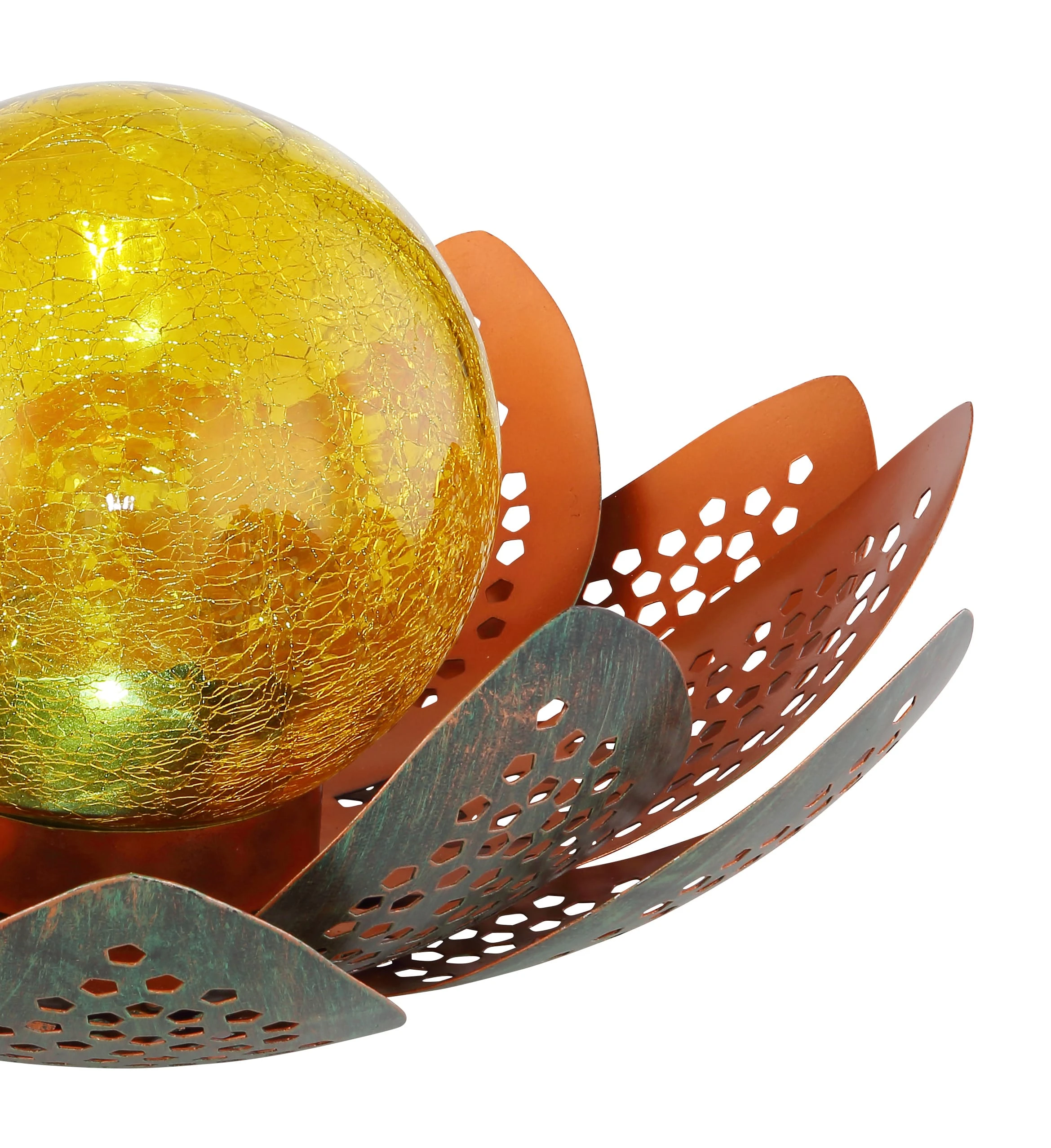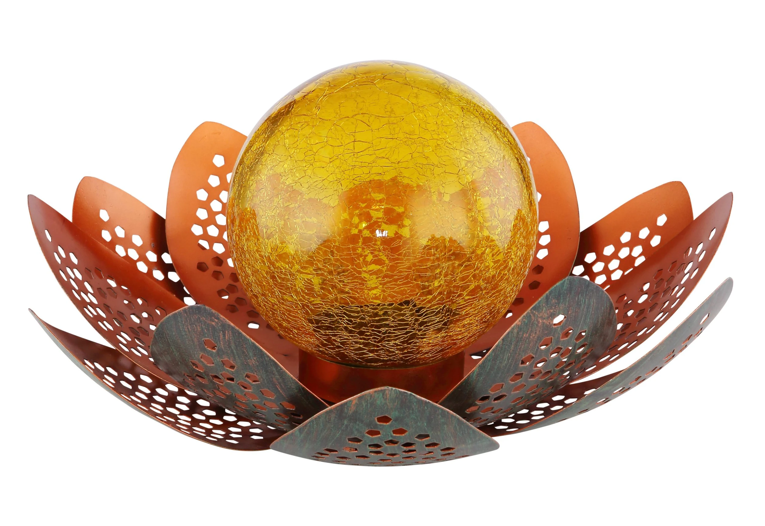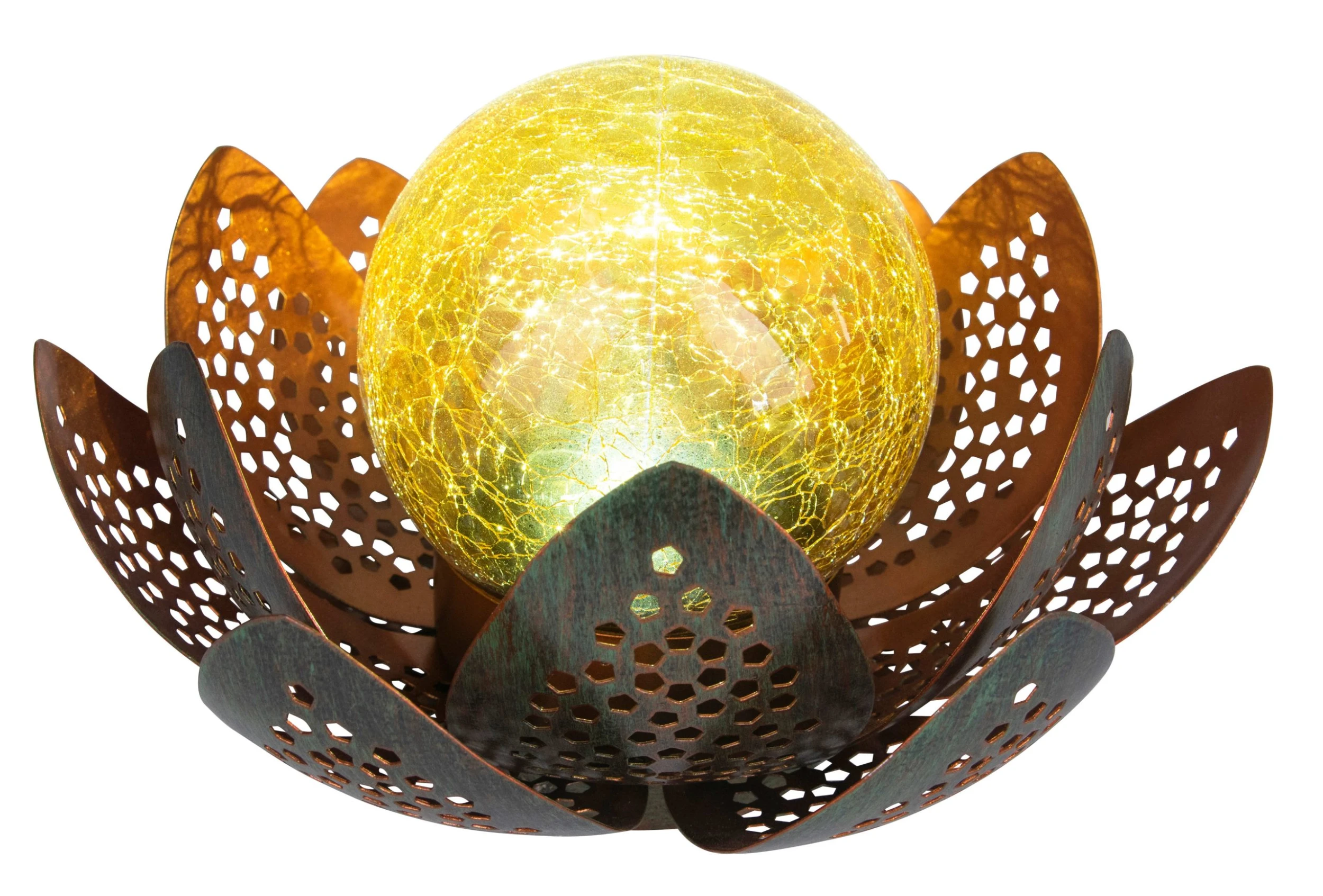 Solarleuchte Metall grün, goldfarben, Glas crackle, amber, Schiebeschalter, Akku inkludiert AAA 300mAh 1.2V, IP44, Blume mit Glaskugel, ø: 350mm, H: 180mm, inkl. LED 0.06W 3.2V, 6500K