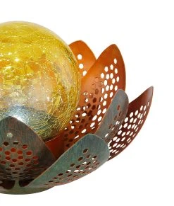 Solarleuchte Metall grün, goldfarben, Glas crackle, amber, Schiebeschalter, Akku inkludiert AAA 300mAh 1.2V, IP44, Blume mit Glaskugel, ø: 220mm, H: 135mm, inkl. LED 0.06W 3.2V, 6500K