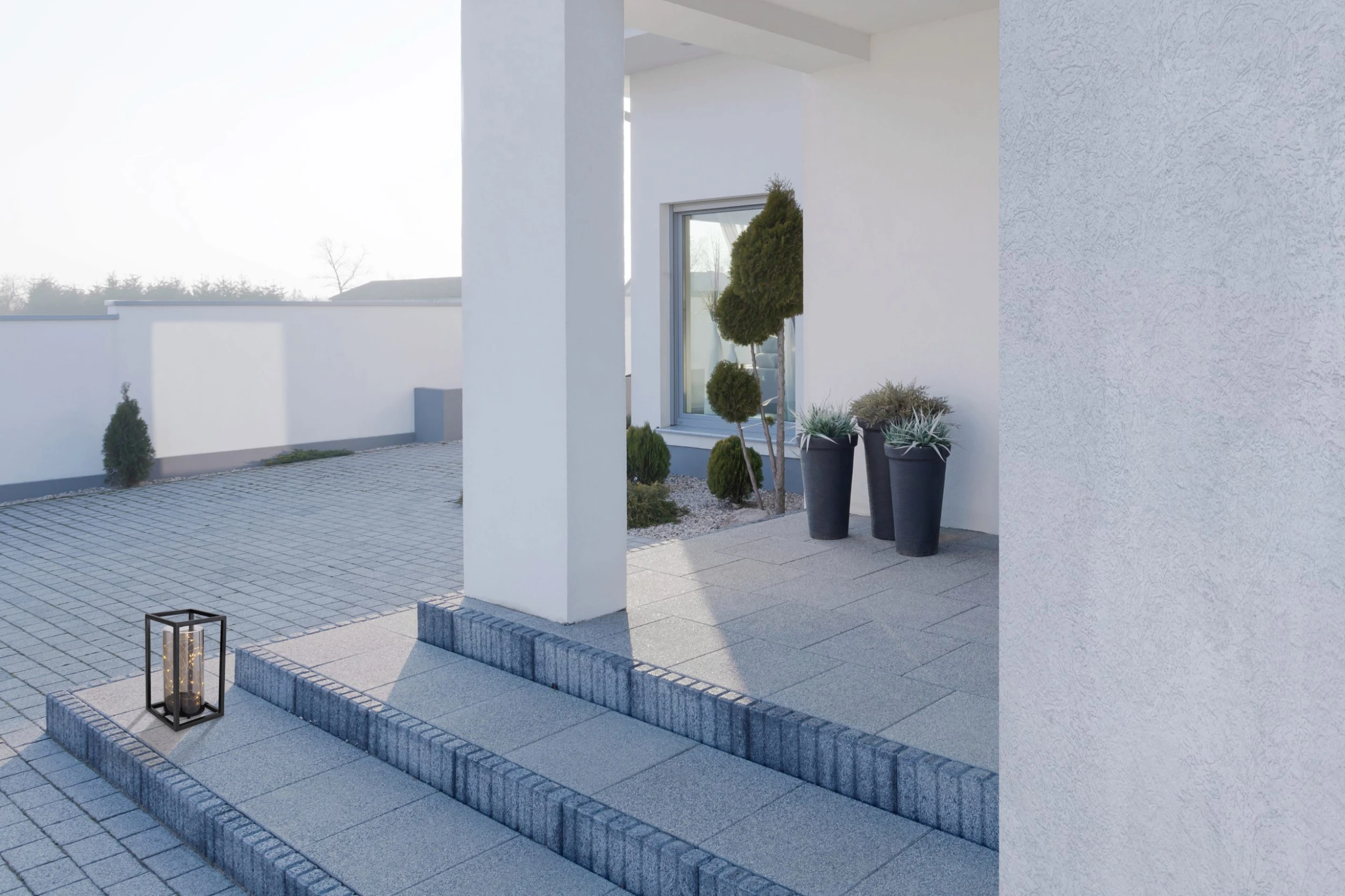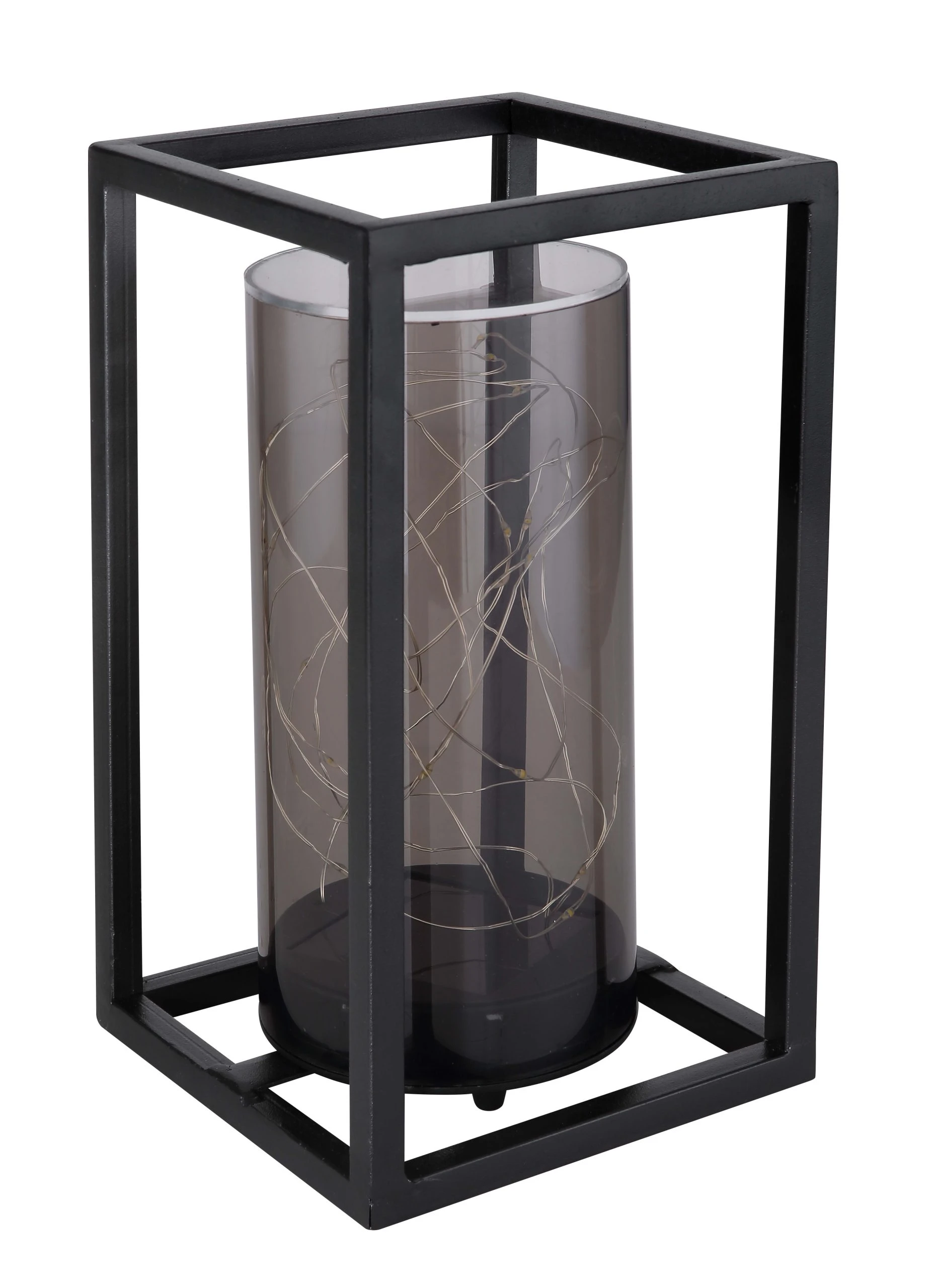 Solarleuchte Metall schwarz, Acryl, Druckschalter, Akku inkludiert AA 600mAh 1.2V, IP44, Metallrahmen innen mit Zylinder und Lichterkette, LxBxH: 140x140x250mm, inkl. 30x LED 0.06W 3V, 3000K