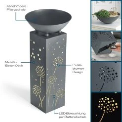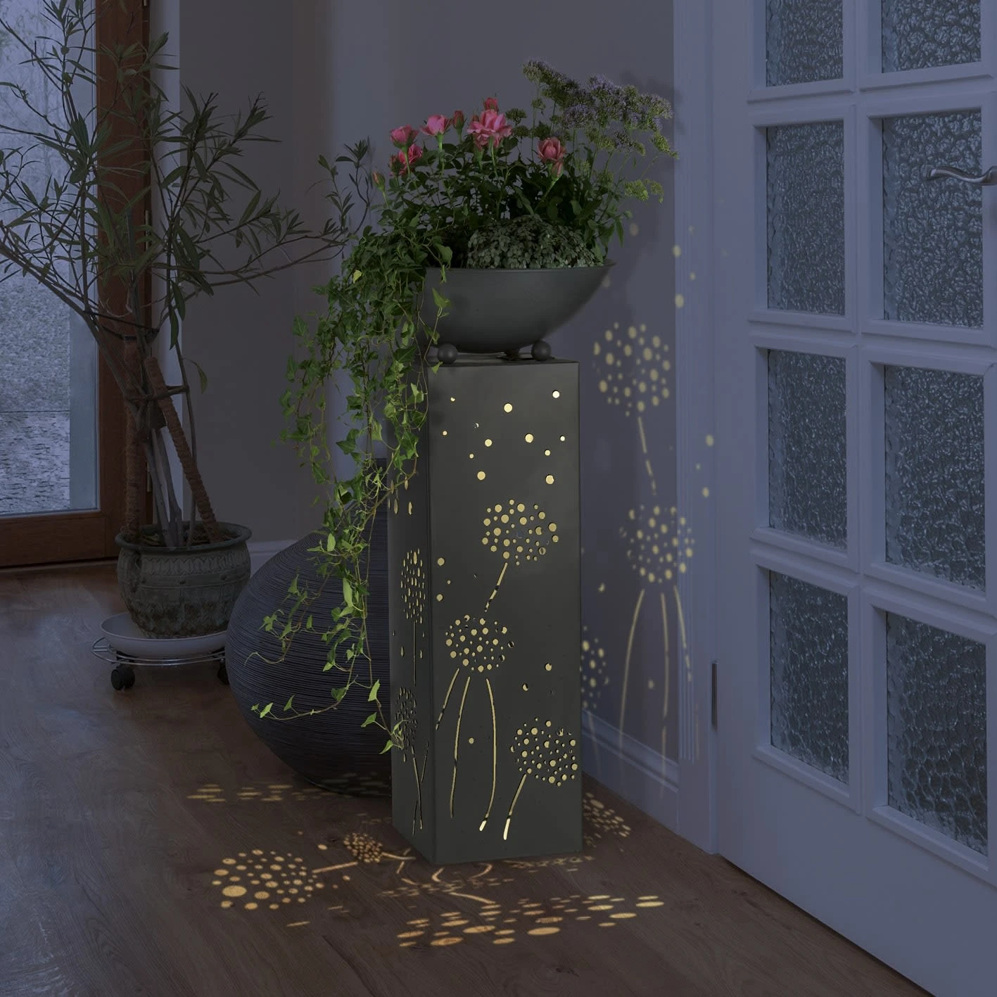 Die Hoberg LED-Pflanzsäule mit gestanzten Pusteblumen vereint LED-Beleuchtung mit einer abnehmbaren Pflanzschale zum Selbstbepflanzen – und das alles in Metall mit stilvoller Beton-Optik. Gerade im Dunkeln ist sie so ein absoluter Hingucker.