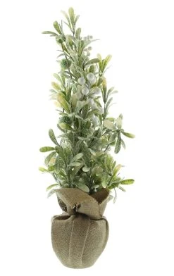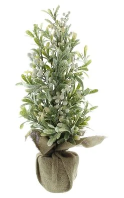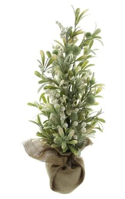 üppig dekoriert mit Beeren, Zweigen und Blättern, geeiste Optik, Glitzerfinish, Kunststoff, Topf mit Jute umwickelt