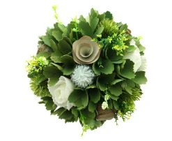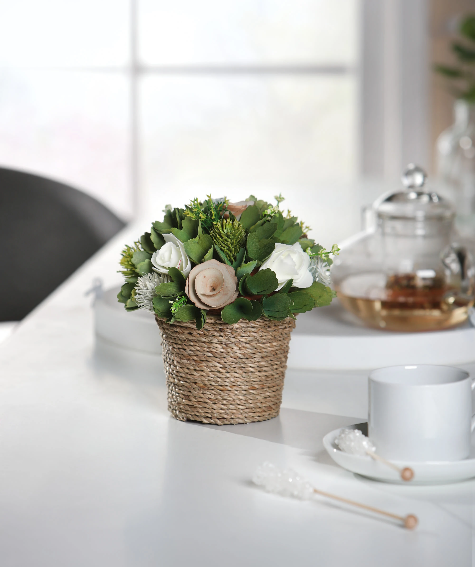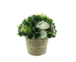 dekoratives Blumensträußchen mit Blüten und Blättern aus Kunststoff, Topf umwickelt mit Sisalschnur