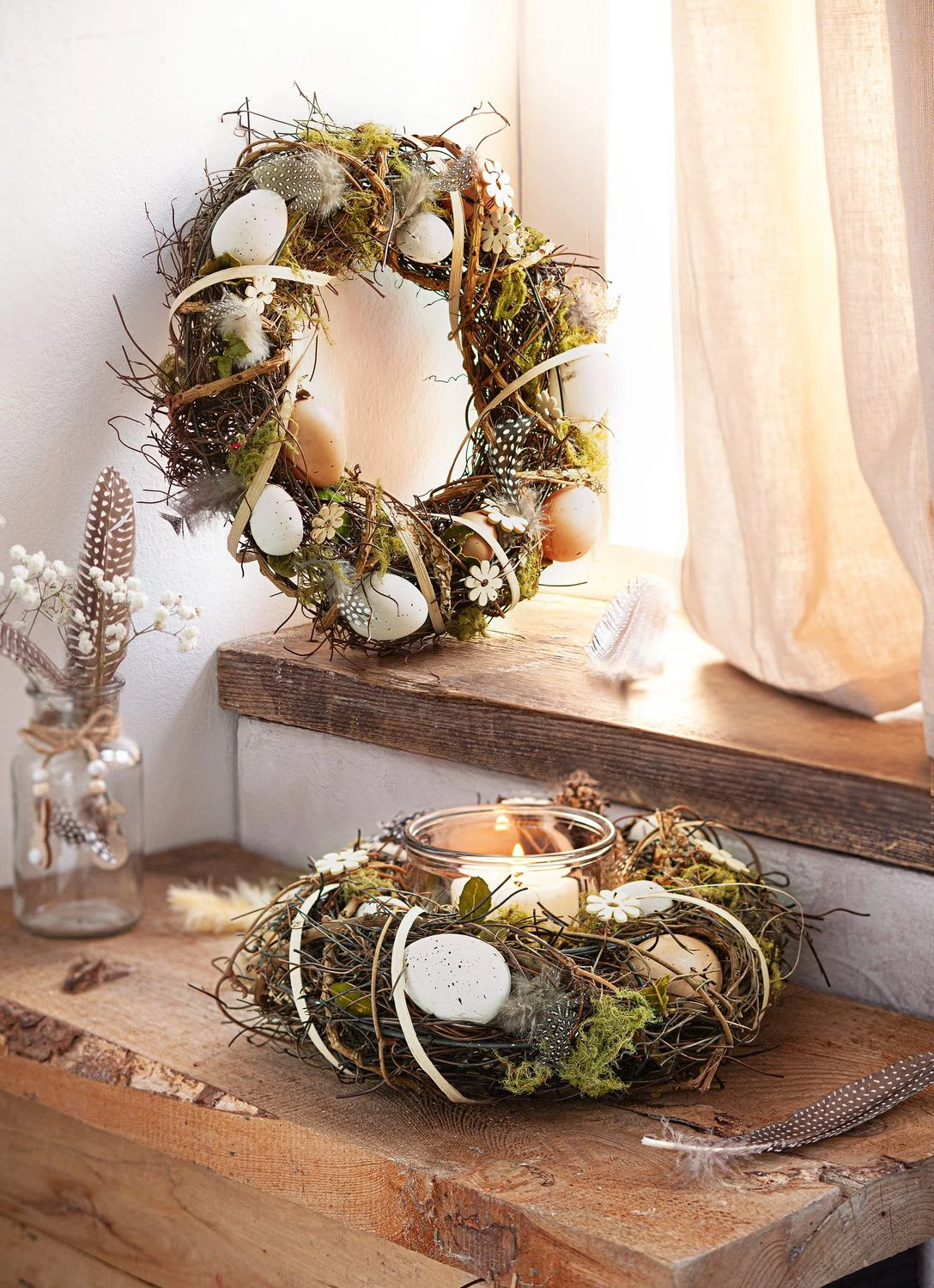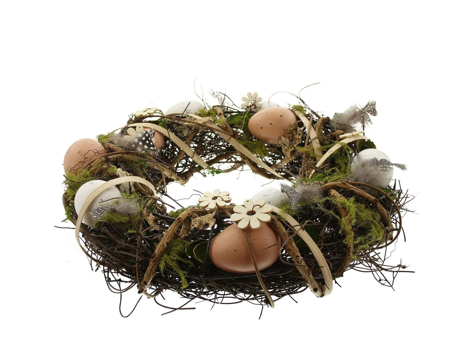 Reisig auf Metallgestell geflochten, üppig verziert mit Moos, Holzblumen und Kunststoffeiern
