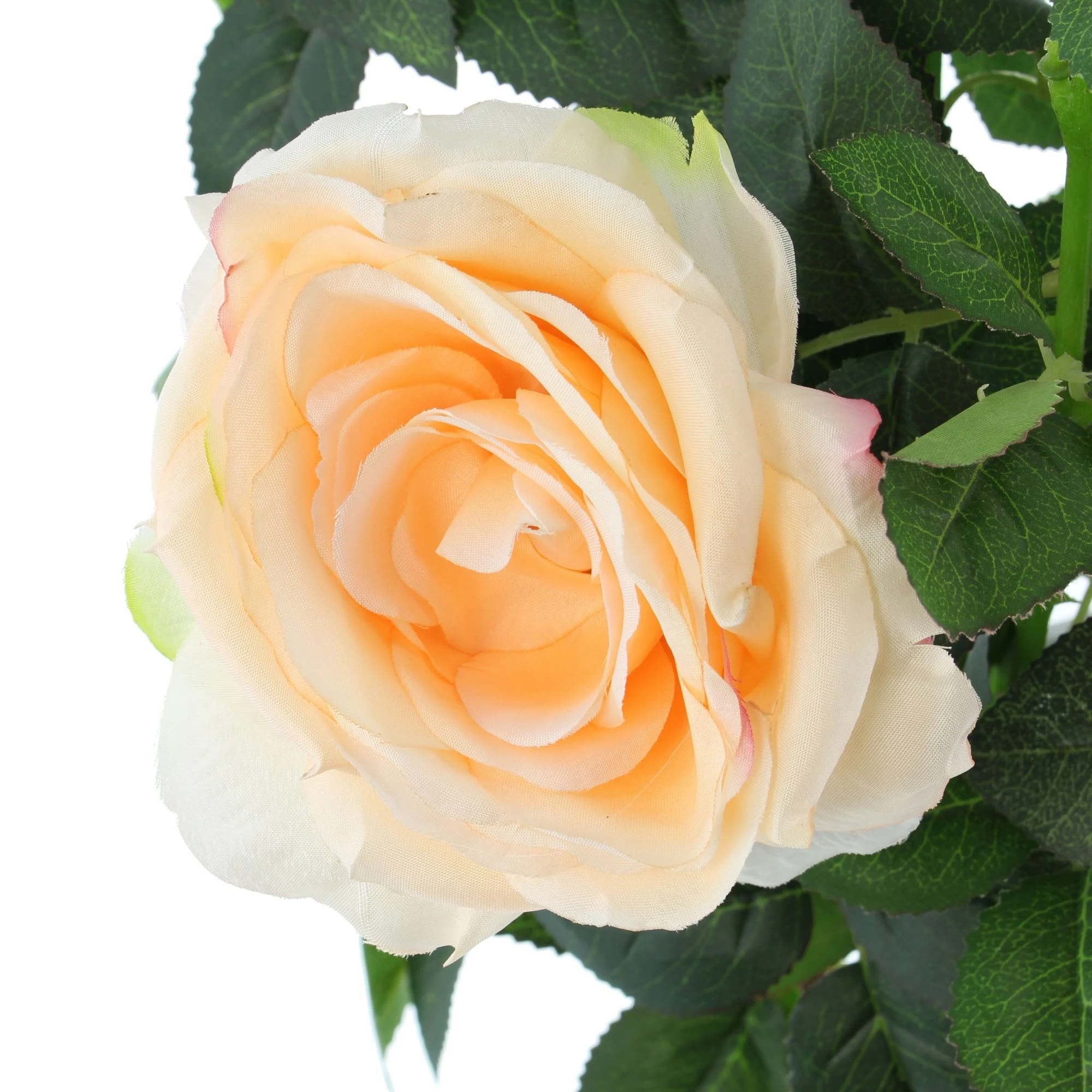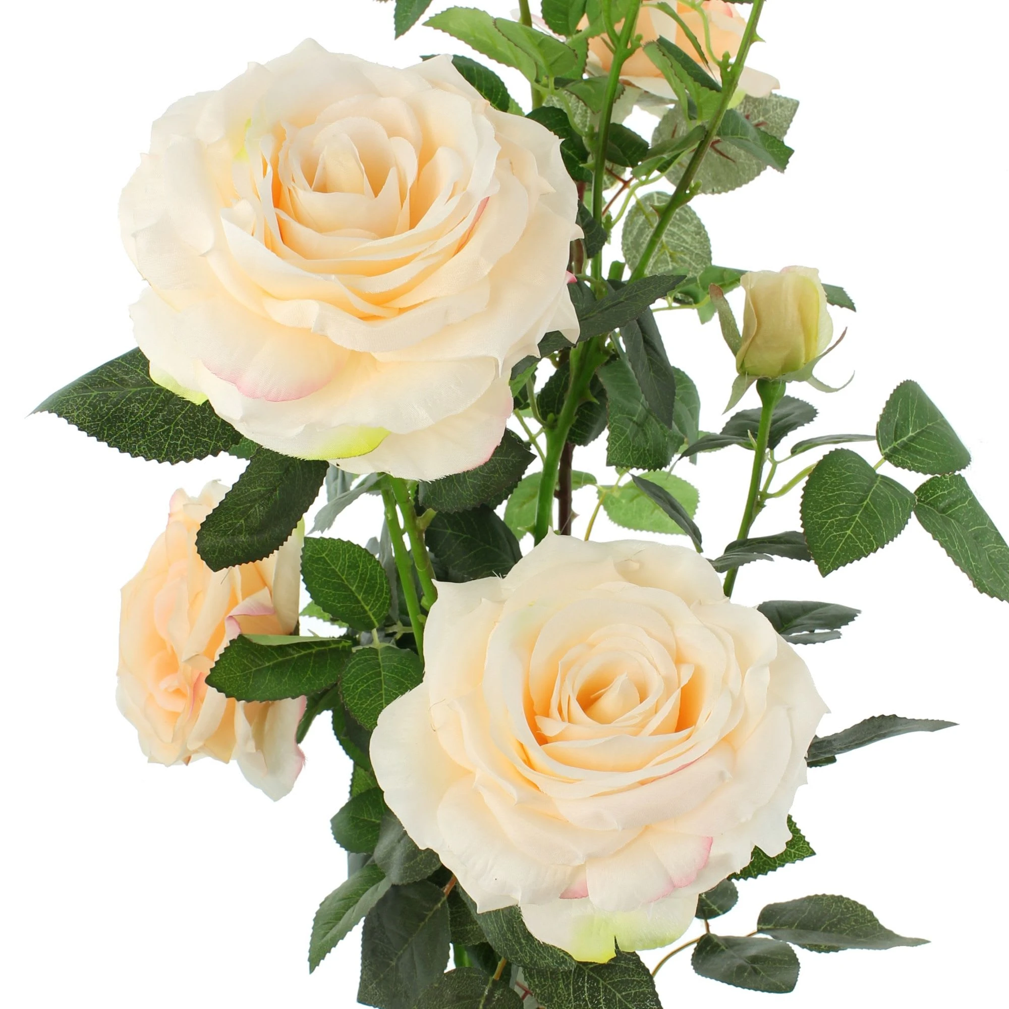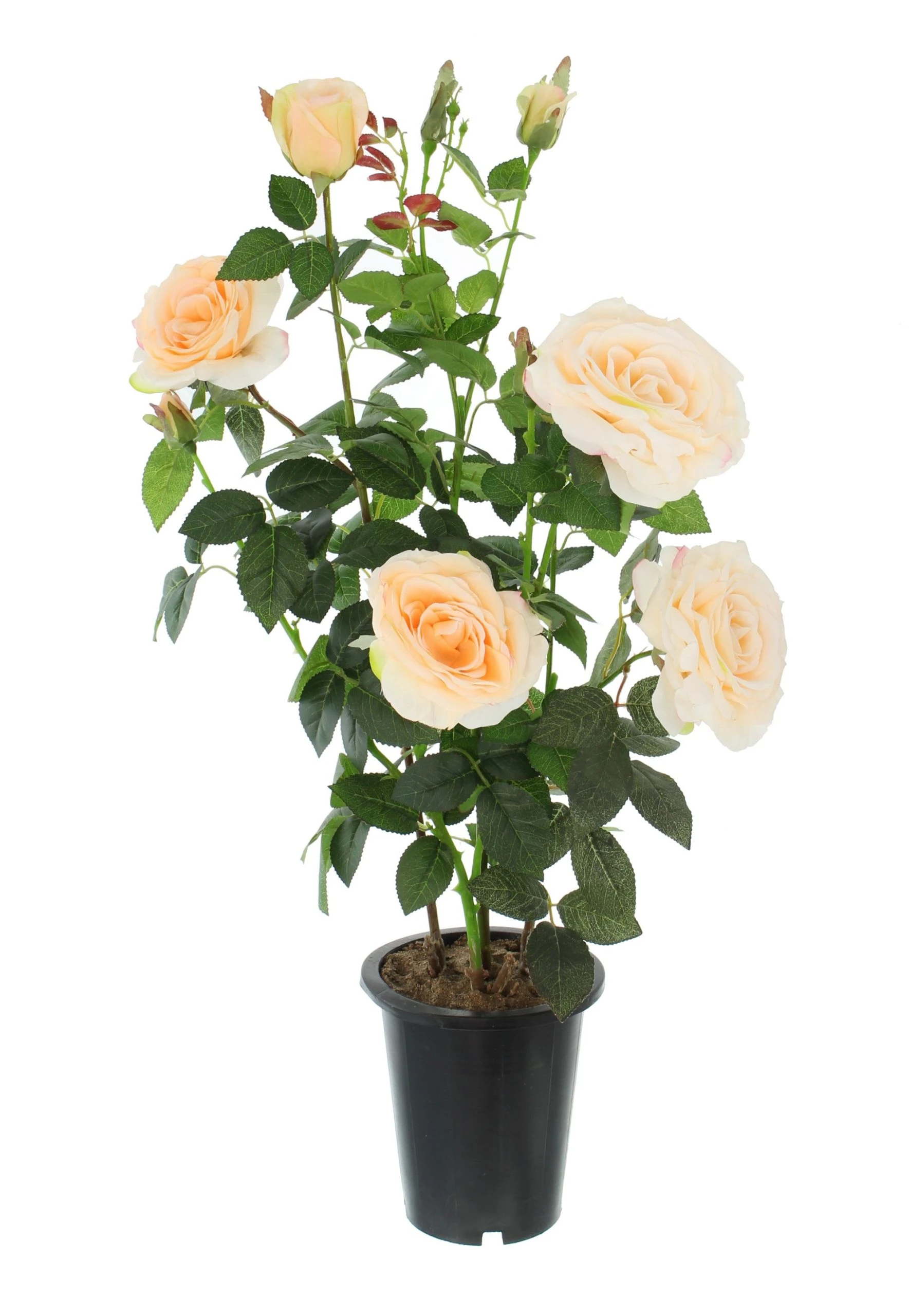 wundervolles Blumen-Arrangement aus Kunststoff, täuschend echt aussehende Rosenblüten aus Textil in zartem Lachston, schwarzer Kunststofftopf