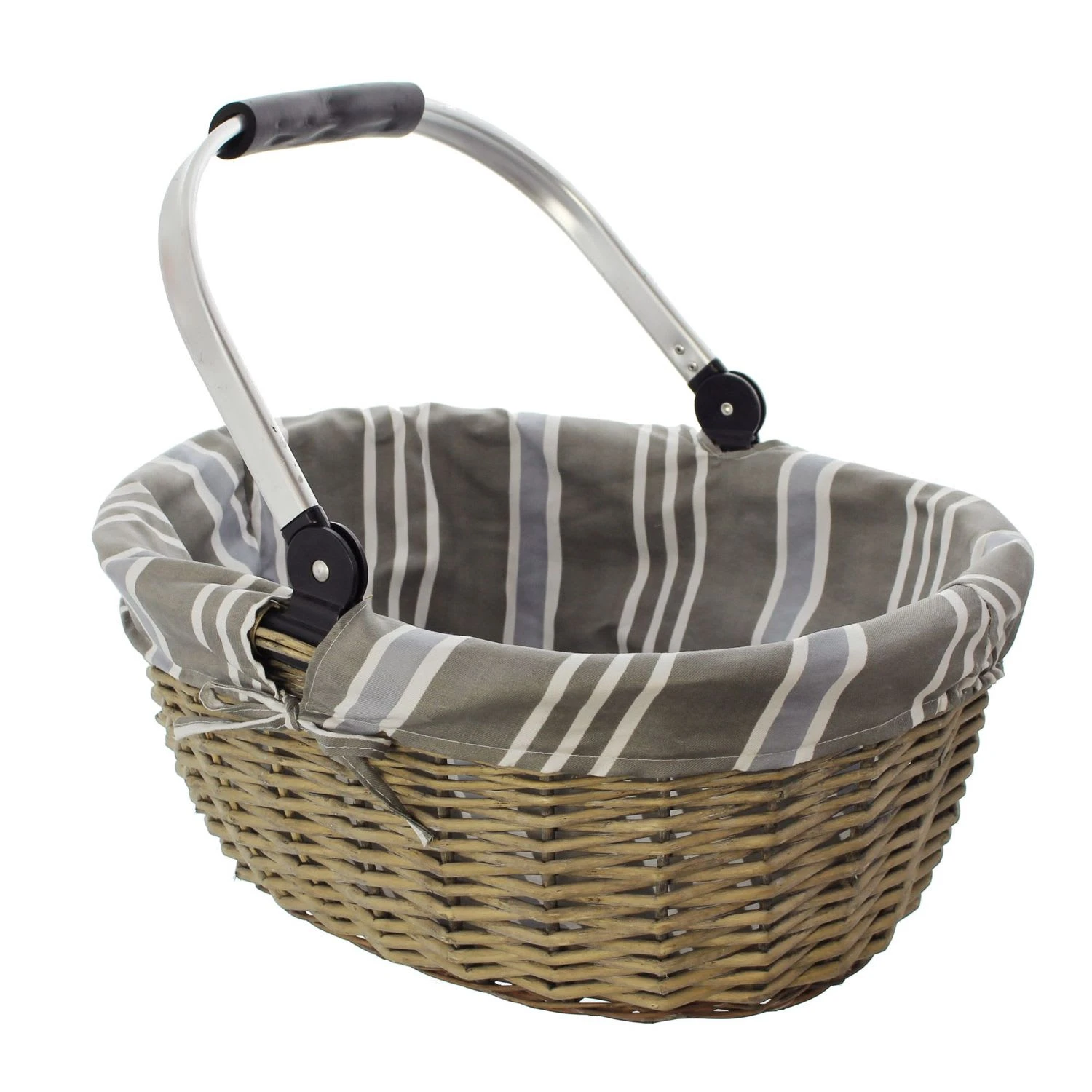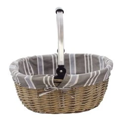 in moderner Farbgebung, grau gekalkte Vollweide mit umklappbarem Metallbügel, herausnehmbare Textileinlage mit Streifenmuster