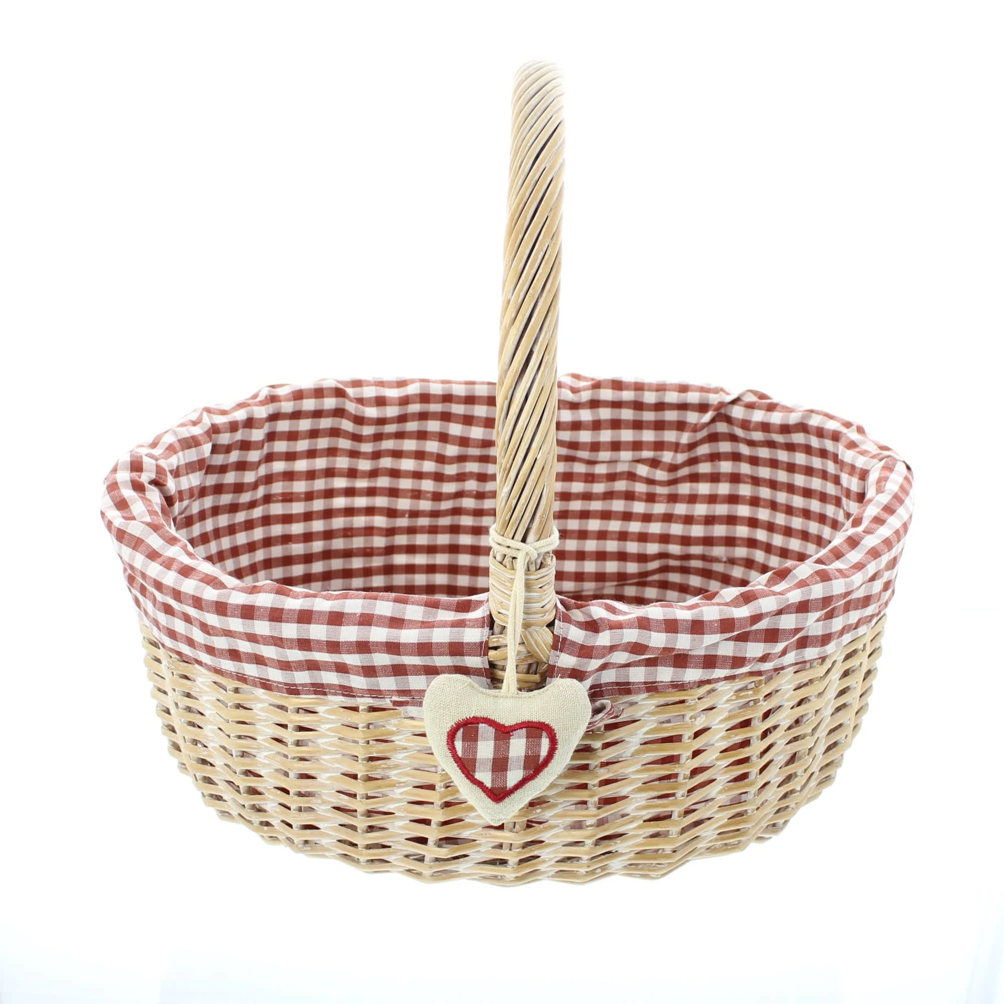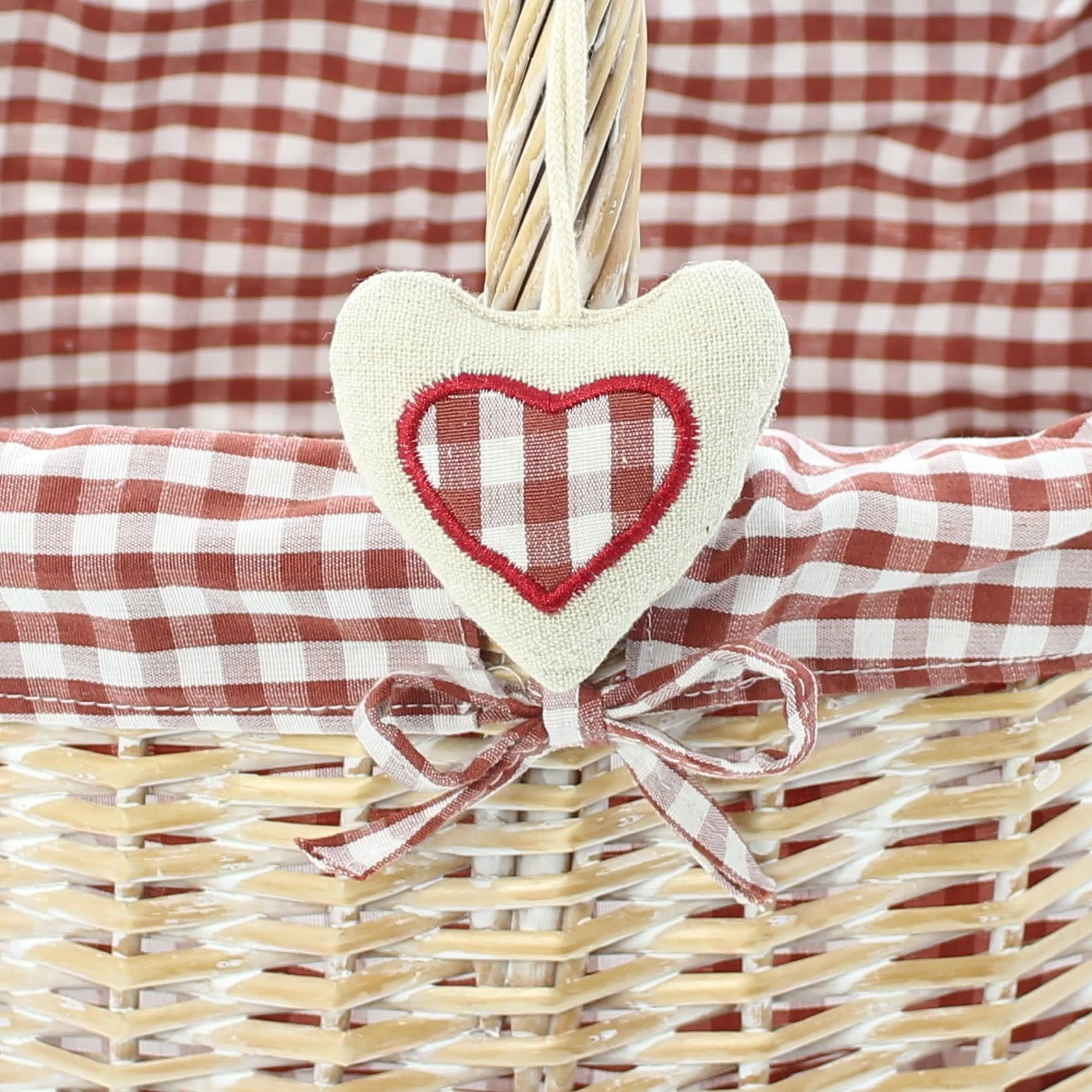 Einkaufshelfer in trendig rustikalem Karodesign, weiß gekalkte und stabil geflochtene Spaltweide, herausnehmbare Textileinlage in nostalgischem Rot/Weiß, farblich passender, niedlicher Textilherzanhänger