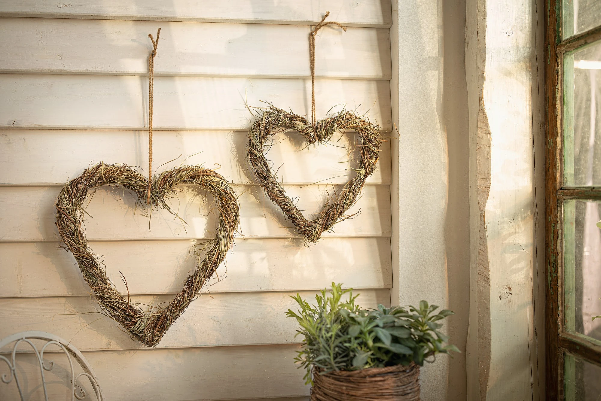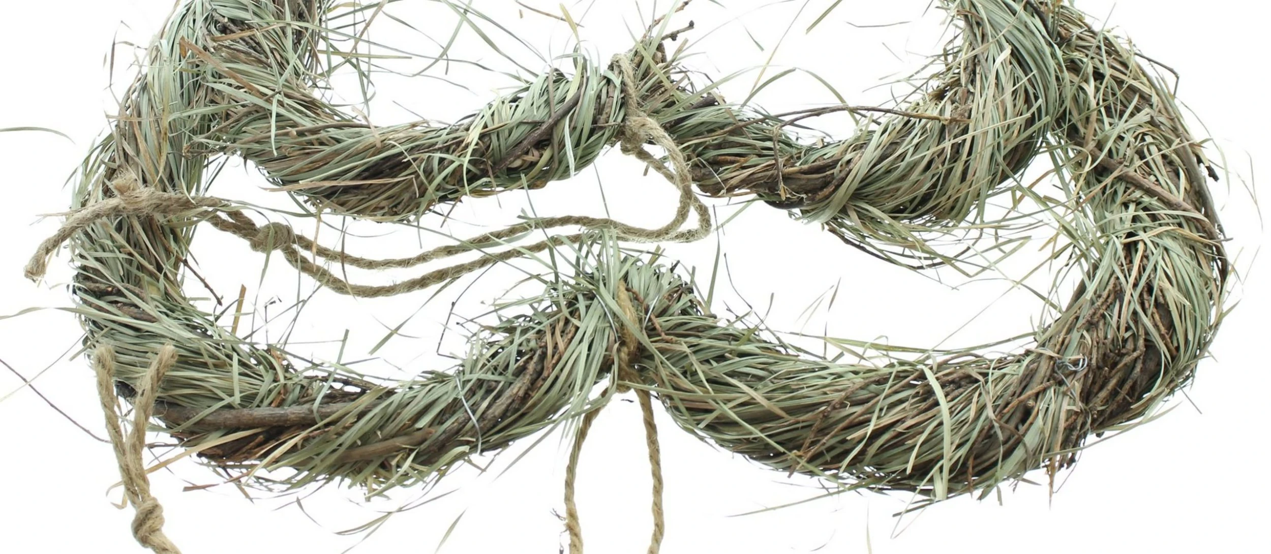 naturbelassenes Holz und Stroh, dekorativ auf Metallrahmen gebunden