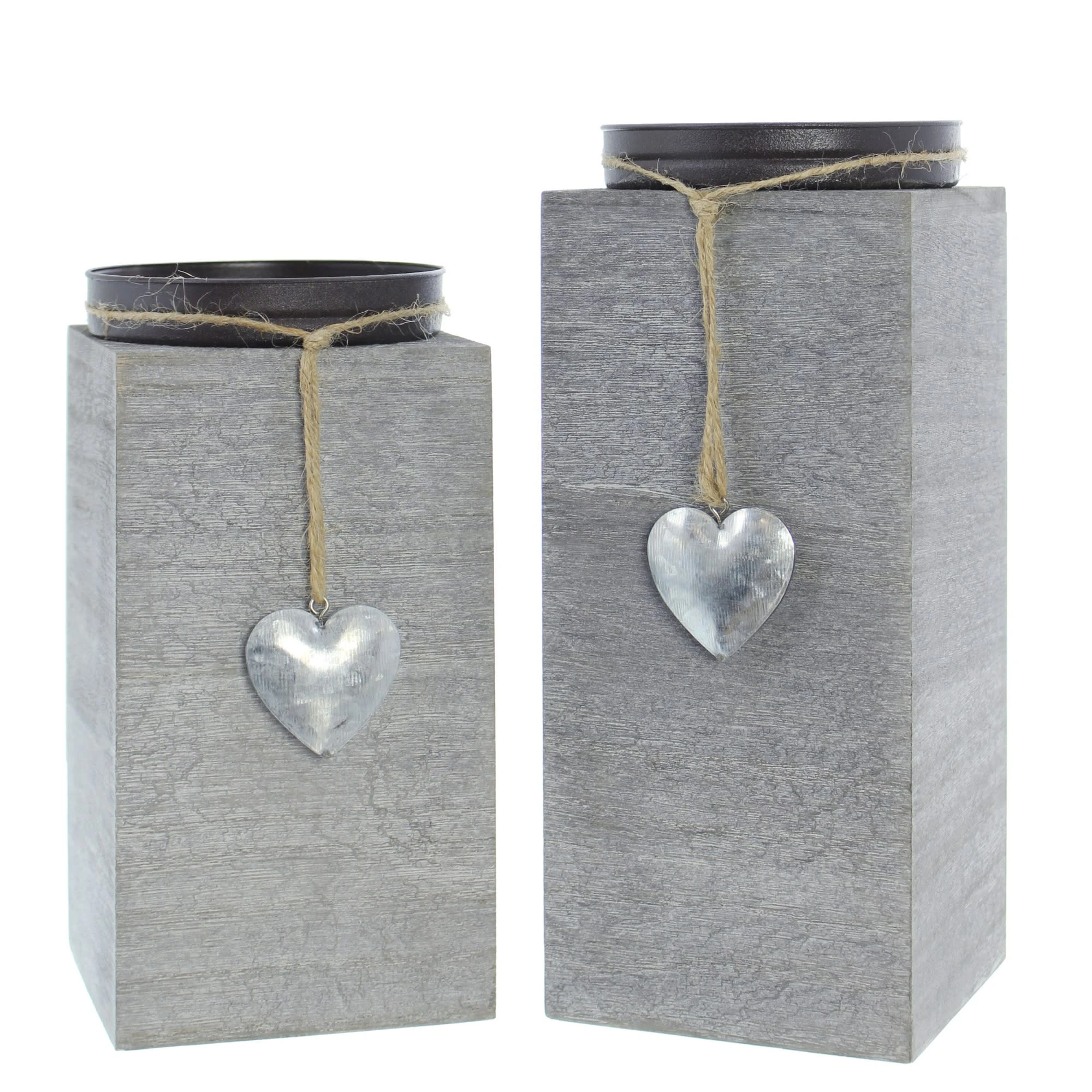 schlicht romantisches Design, grau lackiertes Holz, Kerzenteller aus Blech, dekoriert mit Schnur und kleinem Blechherz in schimmerndem Silber