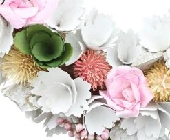 üppige Blumendeko, frische Farben, Holz, Kunststoff