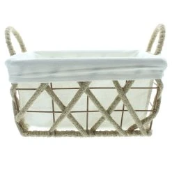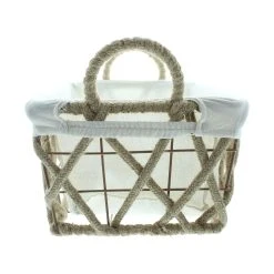 dunkelgrau lackiertes Metall, dekoriert mit dicker Jutekordel, seitliche Griffe, cremefarbener Leineneinsatz