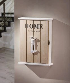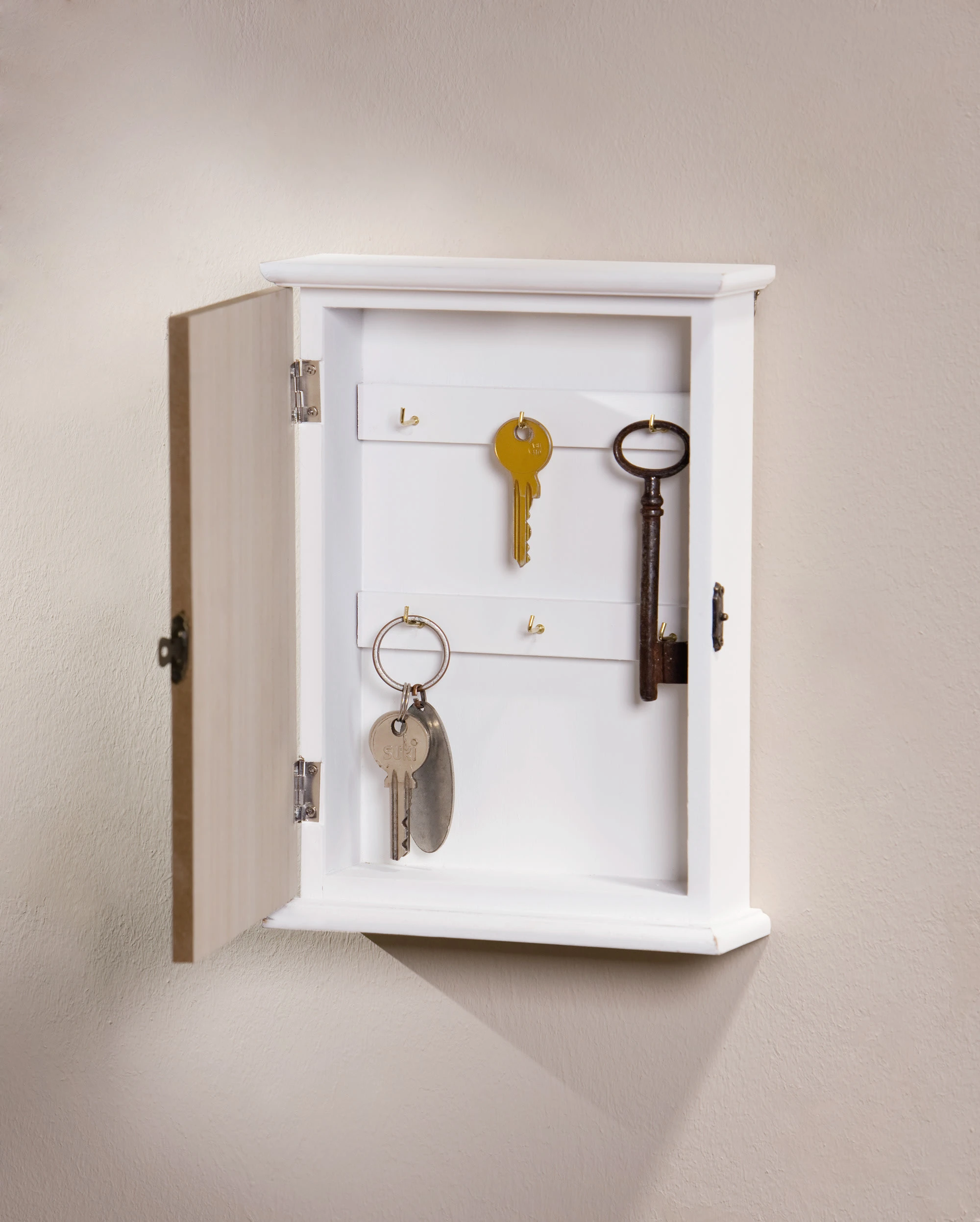 6 Schlüsselhaken aus Metall, Hängevorrichtung an der Rückseite, mattweiß lackiertes Gehäuse, Tür aus natürlich braunem Holz mit Schriftzug und Schlüsselapplikation, seitlicher Metallverschluss