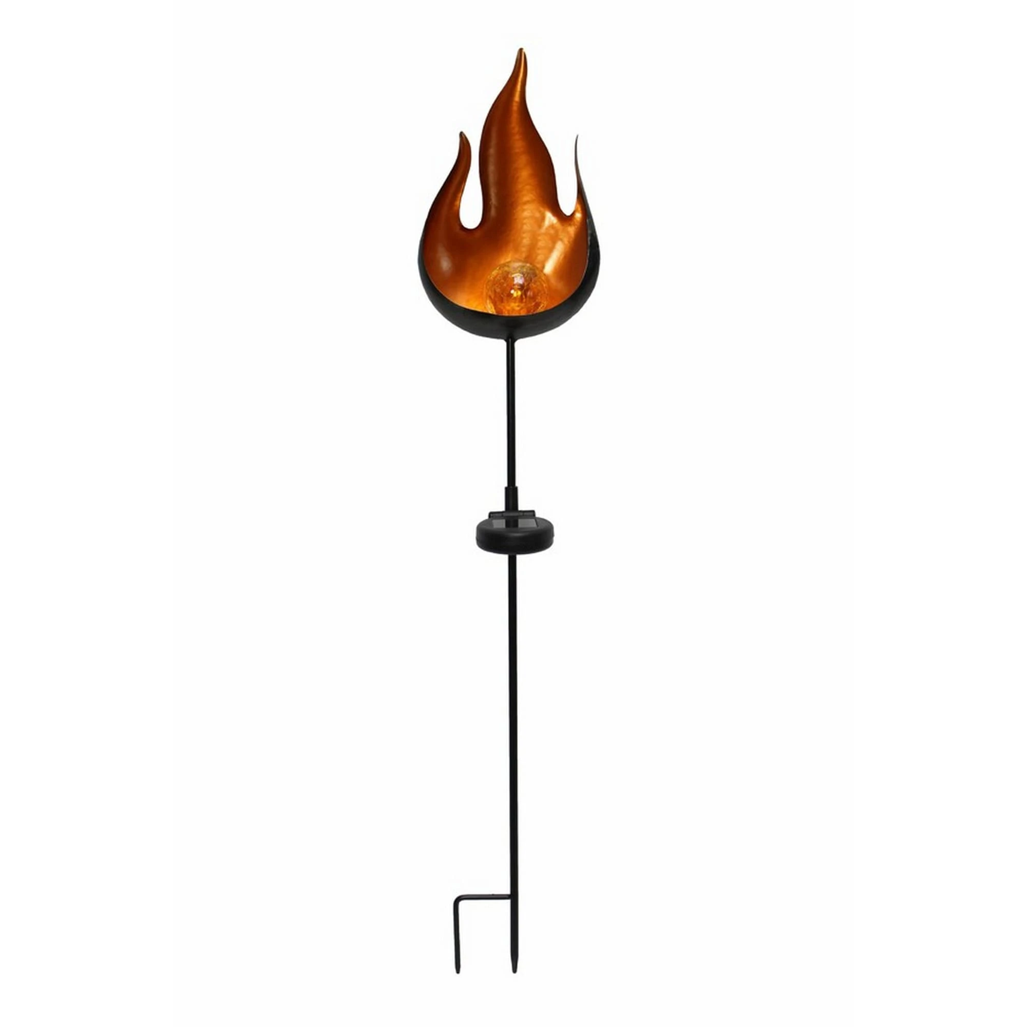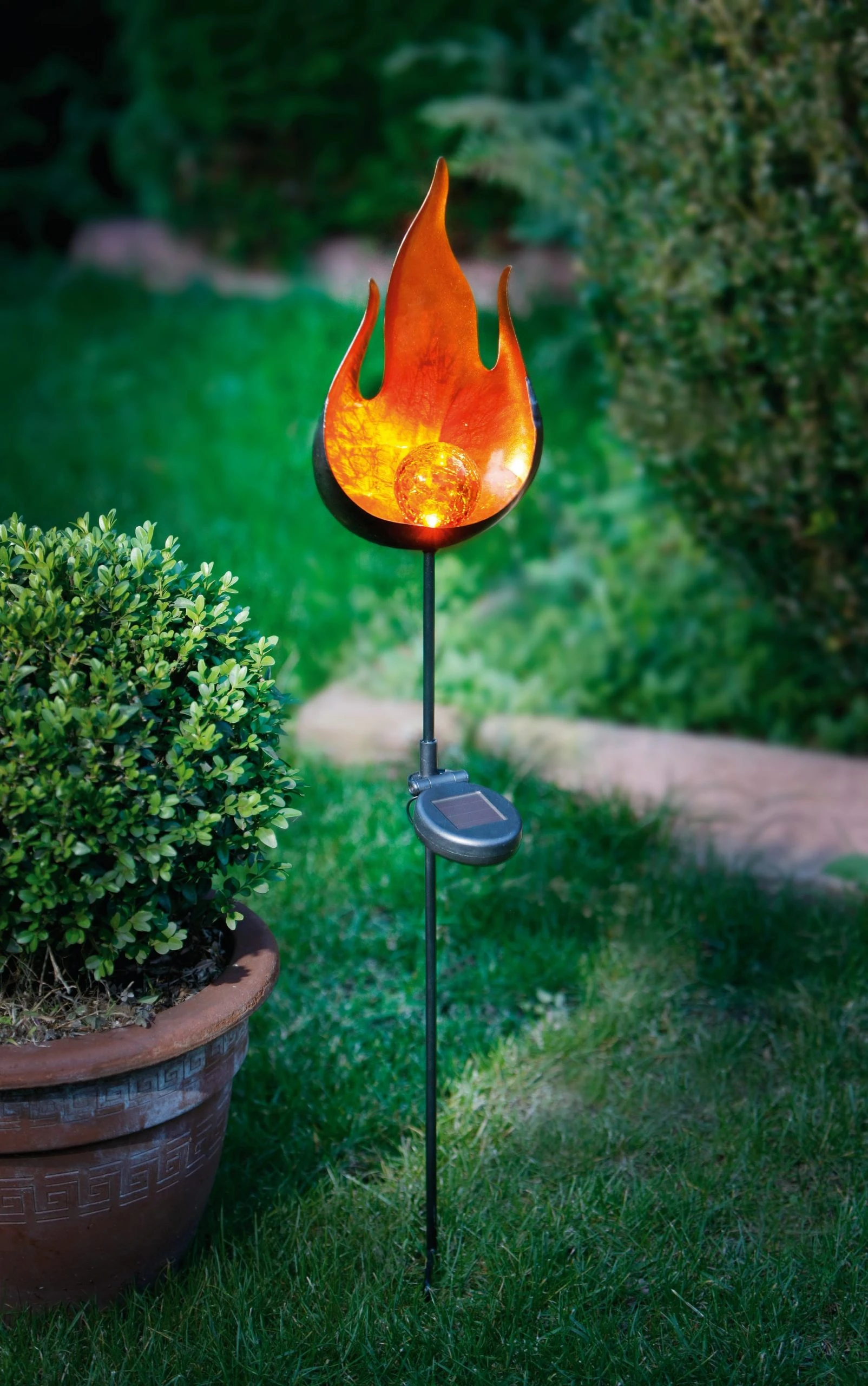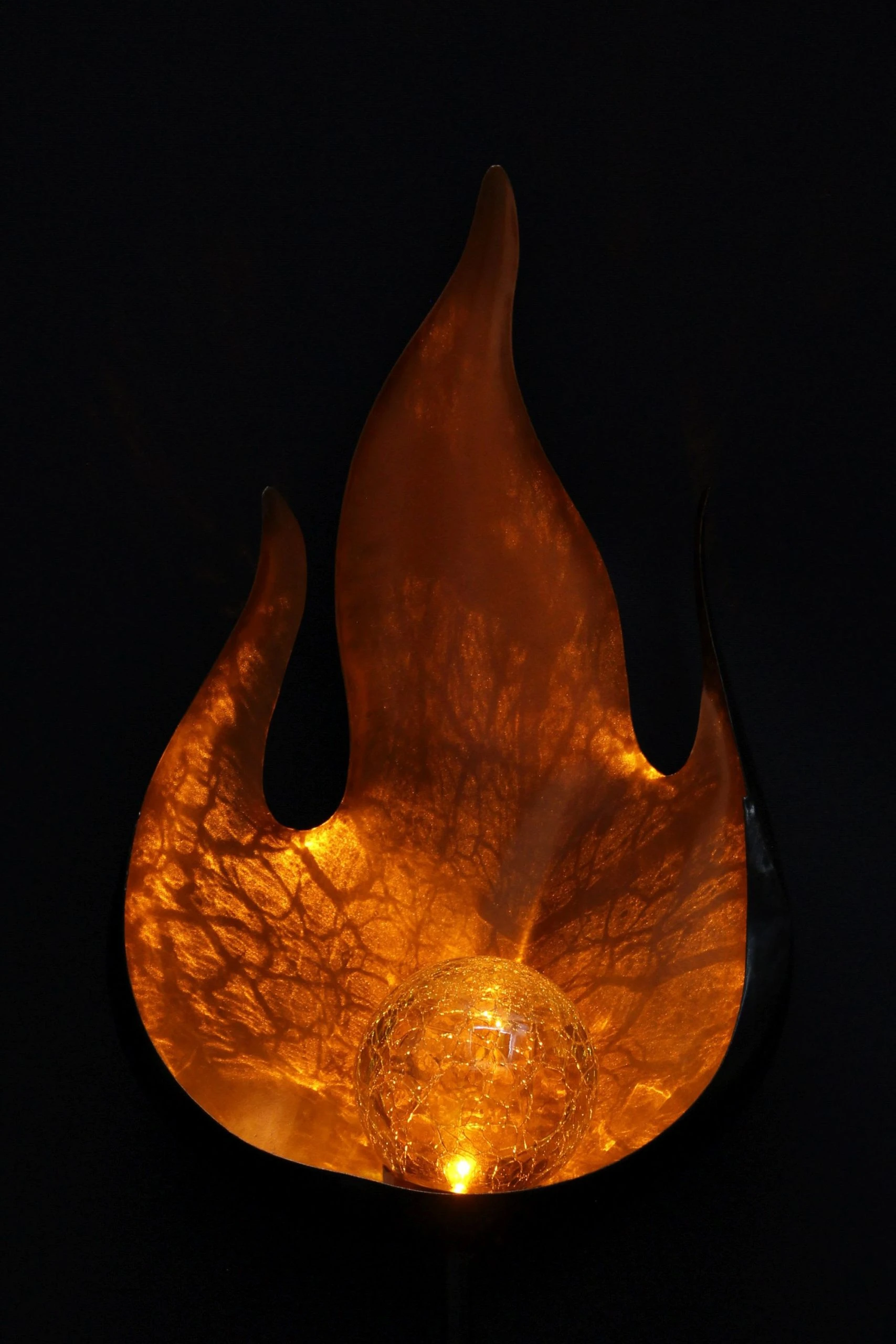 toller Hingucker für den Garten, mattschwarz lackiertes Metall mit Flamme in kräftigem Goldorange, Solarpanel für LED-Diode in orange/gelber Glaskugel, leuchtet automatisch bei Dunkelheit, Batterie im Lieferumfang enthalten