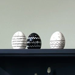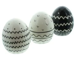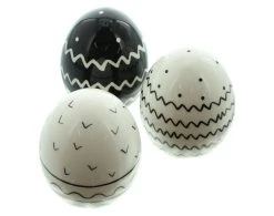 moderne Osterdeko aus Porzellan, glänzend lackiert mit grafischen Mustern in Schwarz und Weiß