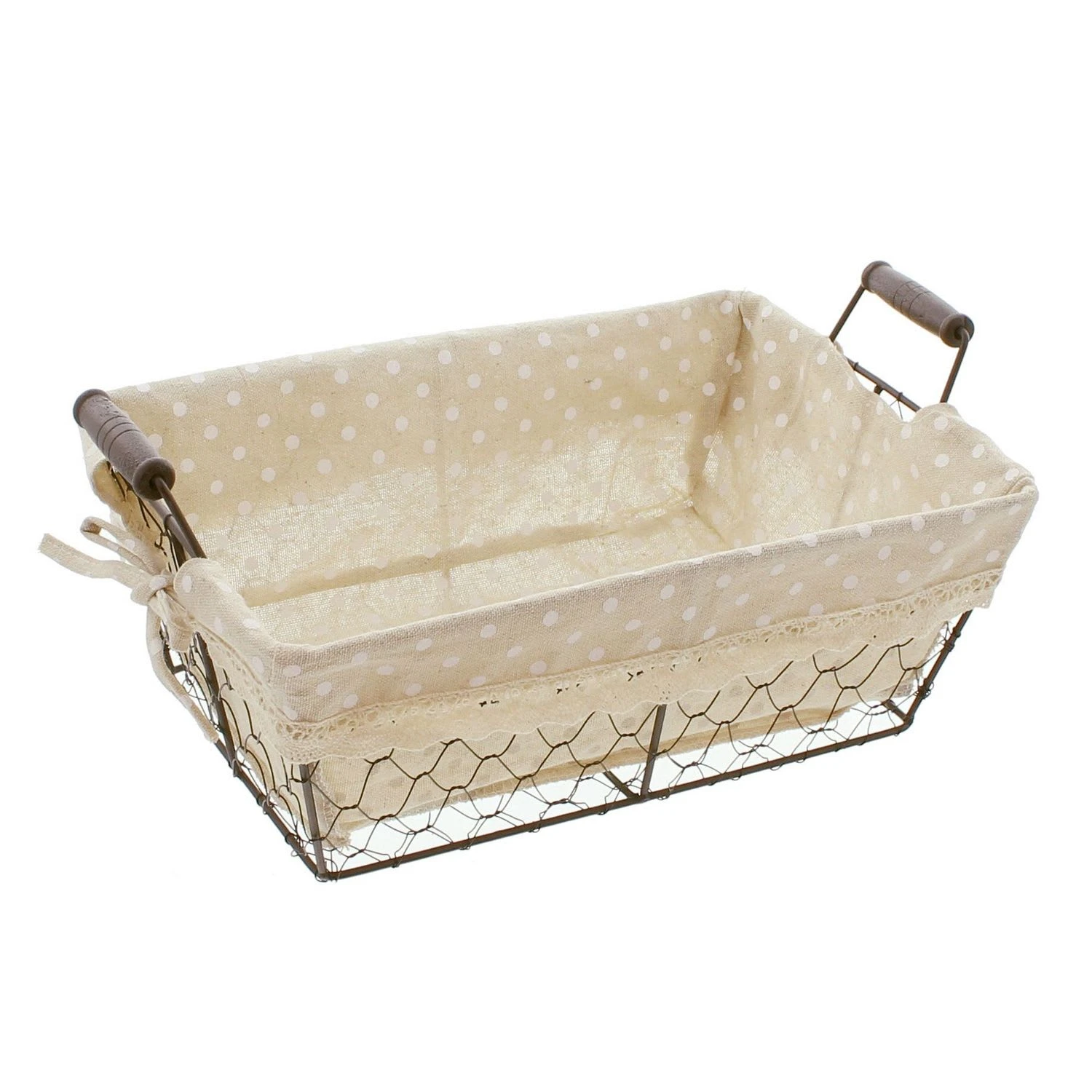 herausnehmbare Textileinlage mit modischem Pünktchenprint und aufwändiger Häkelborte, Metallrahmen mit Drahtgeflecht, seitliche Holzgriffe
