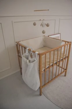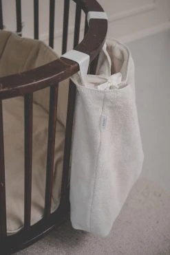 Koeka stellt Laufstallzubehör in verschiedenen Materialien, Stilen und Farben her, so dass jeder ein Produkt nach seinem Geschmack finden kann. Meistens steht der Laufstall im Wohnzimmer, daher ist es schön, wenn das Laufstallzubehör zur Einrichtung passt. In dieser praktischen Laufgittertasche können Sie alles aufbewahren, was Sie wollen. Spielzeug, Windeln, Kleider, Kuscheltiere; alles, was den Laufstall zu voll macht oder worüber Sie lieber nicht stolpern möchten, können Sie darin aufbewahren. Die Aufbewahrungstasche lässt sich mit zwei Schlaufen mit Druckknöpfen einfach am Laufstall oder am Bett befestigen. Man kann den Laufgitterbeutel oben mit einem in der Mitte angebrachten Band verschließen. Der Laufgitterbeutel hat einen verstärkten losen Boden, der vor dem Waschen entfernt werden muss.