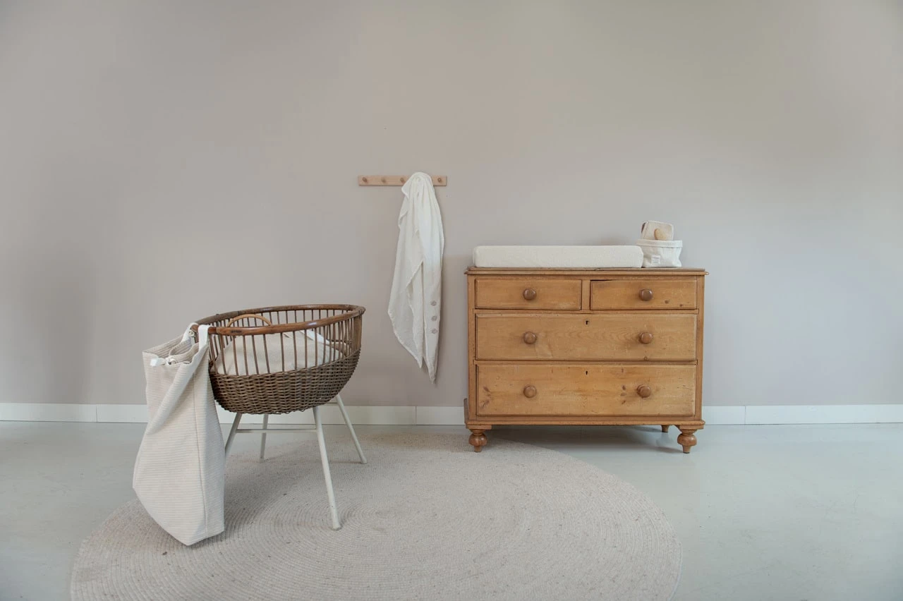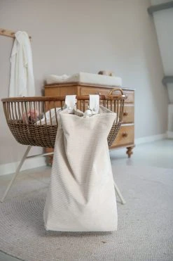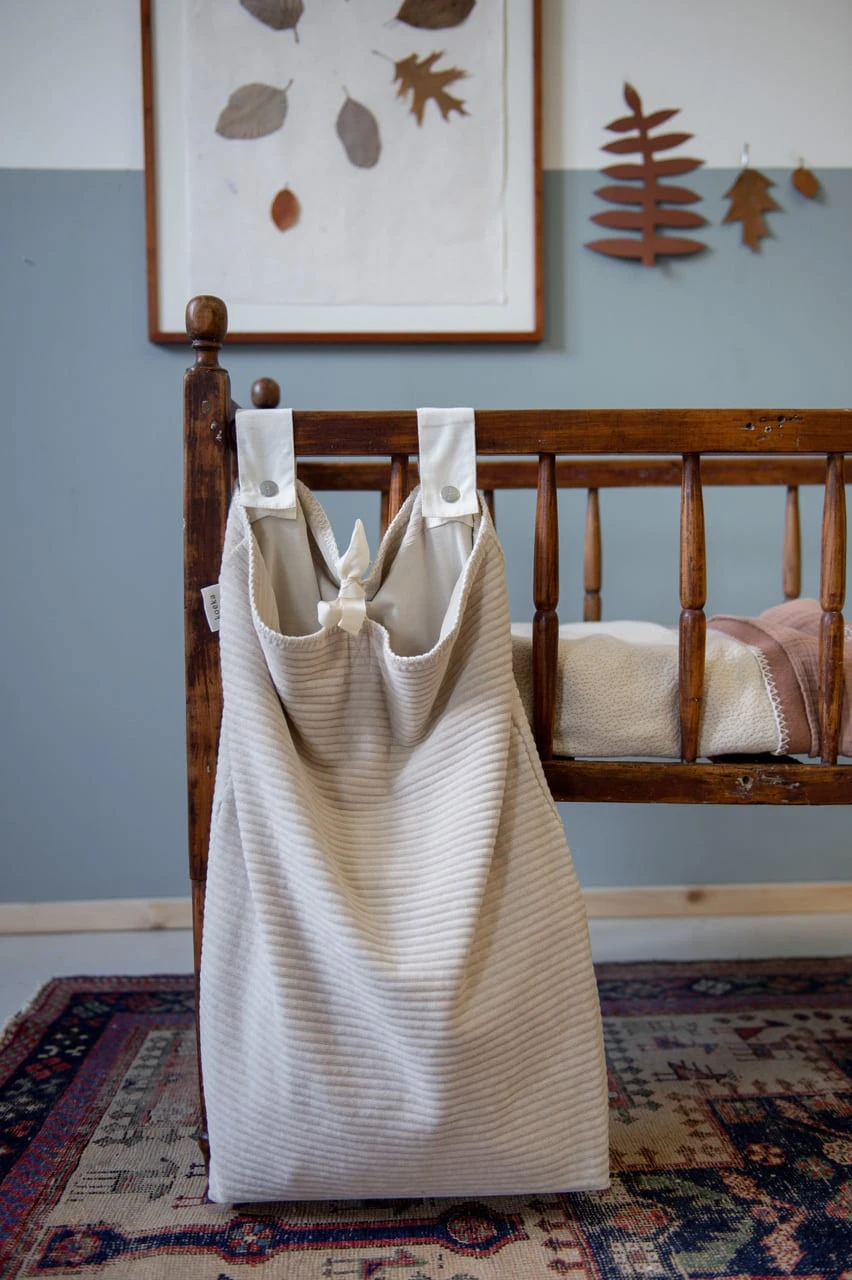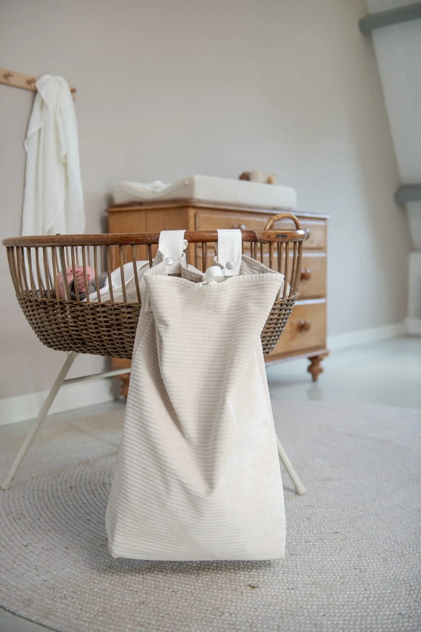 Koeka stellt Laufstallzubehör in verschiedenen Materialien, Stilen und Farben her, so dass jeder ein Produkt nach seinem Geschmack finden kann. Meistens steht der Laufstall im Wohnzimmer, daher ist es schön, wenn das Laufstallzubehör zur Einrichtung passt. In dieser praktischen Laufgittertasche können Sie alles aufbewahren, was Sie wollen. Spielzeug, Windeln, Kleider, Kuscheltiere; alles, was den Laufstall zu voll macht oder worüber Sie lieber nicht stolpern möchten, können Sie darin aufbewahren. Die Aufbewahrungstasche lässt sich mit zwei Schlaufen mit Druckknöpfen einfach am Laufstall oder am Bett befestigen. Man kann den Laufgitterbeutel oben mit einem in der Mitte angebrachten Band verschließen. Der Laufgitterbeutel hat einen verstärkten losen Boden, der vor dem Waschen entfernt werden muss.