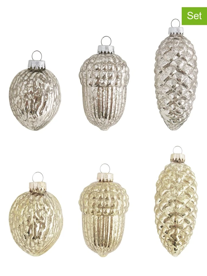 – Inhalt: 9 Christbaumornamente in verschiedenen Designs (3x Walnüsse in Gold, 3x Walnüsse in Silber, 3x Eicheln in Gold, 3x Eicheln in Silber, 3x Zapfen in Gold, 3x Zapfen in Silber)