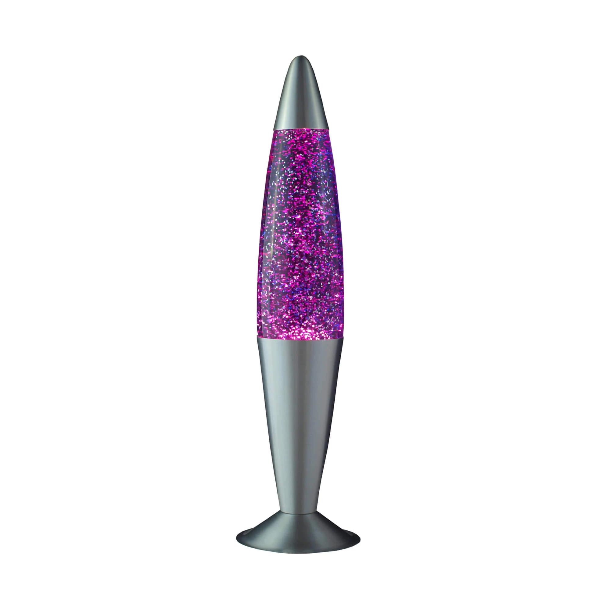 Fassung: E14 max. 25 Watt | Farbe: Glitter (Violett), Transparent, Silber | Material: Aluminium, Glas | Spannung: 230V | Spritzschutzklasse:IP20 | Lumen: 210 lm | stilechte Lavalampe im angesagten Retro Look | eine Lavalampe mal anders: jede Menge beweglicher Glitter in lila Flüssigkeit versprüht Freude pur | eine Stimmungsleuchte für tolle Lichteffekte und eine gemütliche Atmosphäre – sie ist der Hingucker in jedem Wohnzimmer oder auf Ihrer Party (zur alleinigen Beleuchtung eines Raums nicht geeignet) | nach einer Aufwärmzeit entfaltet die Lampe ihr ganz typisches Lava Design und Sie können sich von dem ruhigen Auf und Ab der Wachs Blasen verzaubern lassen | das Gehäuse ist aus silbernem Aluminium und der Leuchtkörper aus robustem Glas, die Lampe wird mittels eines Kabelschalters eingeschalten | Höhe: 420mm | Höhe Glas: 255mm | Ø Glas: 60mm | Ø Fuß: 110mm | mit Kabelschalter | Ø Leuchtmittel: max. 50mm | das Leuchtmittel erzeugt Wärme, die den Lavaprozess in Gang setzt: das kann eine gewisse Zeit (>2 Stunden) in Anspruch nehmen | Achtung: die warme Lavalampe im Betrieb niemals (!) schütteln oder umdrehen, dadurch wird der Prozess empfindlich gestört und es kann zu Verfärbungen der Flüssigkeit kommen