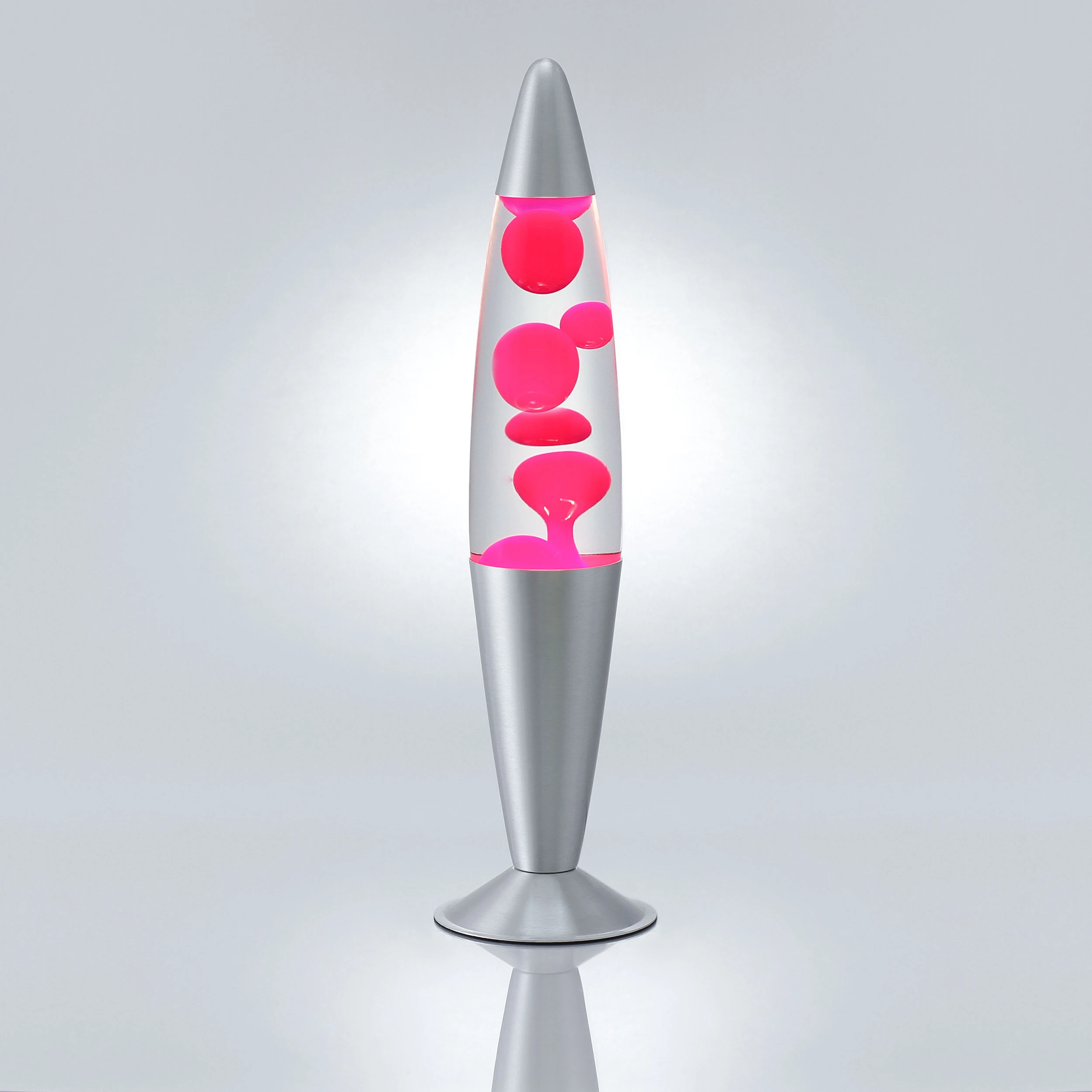 Fassung: G9 max. 25 Watt | Farbe: Pink, Klar, Silber | Material: Aluminium, Glas | Spannung: 230V | Spritzschutzklasse:IP20 | stilechte Lavalampe im angesagten Retro Look | die Verbindung aus pinkem Wachs und transparenter Flüssigkeit versprüht Freude pur | eine Stimmungsleuchte für tolle Lichteffekte und eine gemütliche Atmosphäre – sie ist der Hingucker in jedem Wohnzimmer oder auf Ihrer Party (zur alleinigen Beleuchtung eines Raums nicht geeignet) | nach einer Aufwärmzeit entfaltet die Lampe ihr ganz typisches Lava Design und Sie können sich von dem ruhigen Auf und Ab der Wachs Blasen verzaubern lassen | das Gehäuse ist aus silbernem Aluminium und der Leuchtkörper aus robustem Glas, die Lampe wird mittels eines Kabelschalters eingeschalten | Höhe: 420mm | Höhe Glas: 255mm | Ø Glas: 60mm | Ø Fuß: 110mm | mit Kabelschalter | Ø Leuchtmittel: max. 50mm | das Leuchtmittel erzeugt Wärme, die den Lavaprozess in Gang setzt: das kann eine gewisse Zeit (>2 Stunden) in Anspruch nehmen | Achtung: die warme Lavalampe im Betrieb niemals (!) schütteln oder umdrehen, dadurch wird der Prozess empfindlich gestört und es kann zu Verfärbungen der Flüssigkeit kommen