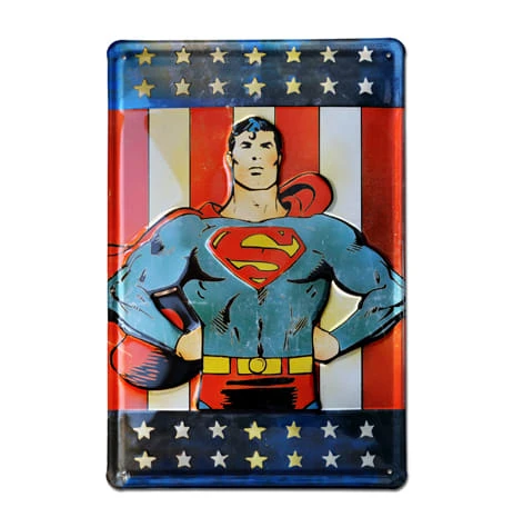Das hochwertige “DC Comics – Superman – America”-Blechschild besitzt an den Ecken eine Ausstanzung zum bequemen Aufhängen. Mit dem tollen Retro-Motiv von Superman findet es sicherlich an jedem Ort einen aufsehenerregenden Platz.