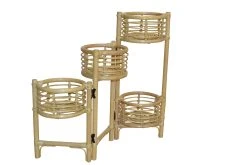 Blumenständer aus Rattanrohr, handgeflochten mit insgesamt 4 handgeflochtenen Blumentopf-Halterungen, Durchmesser je ca. 27 cm. Die Rattanoberfläche ist beigefarben gebeizt und lackiert. Die 3 Felder sind mit Spezialscharnieren verbunden und lassen sich je nach belieben versetzt stellen. Maße ca. cm: B. 66 x T. 30 x H. 78 cm.
