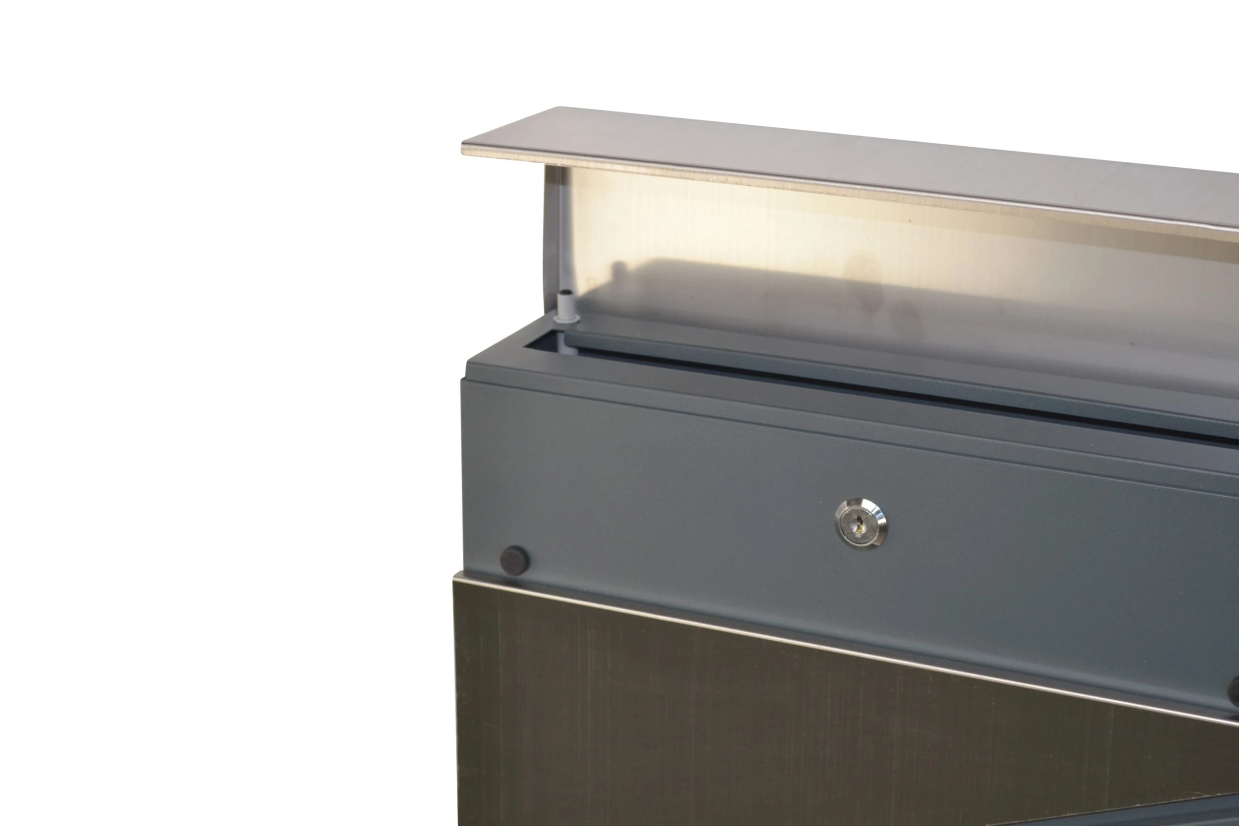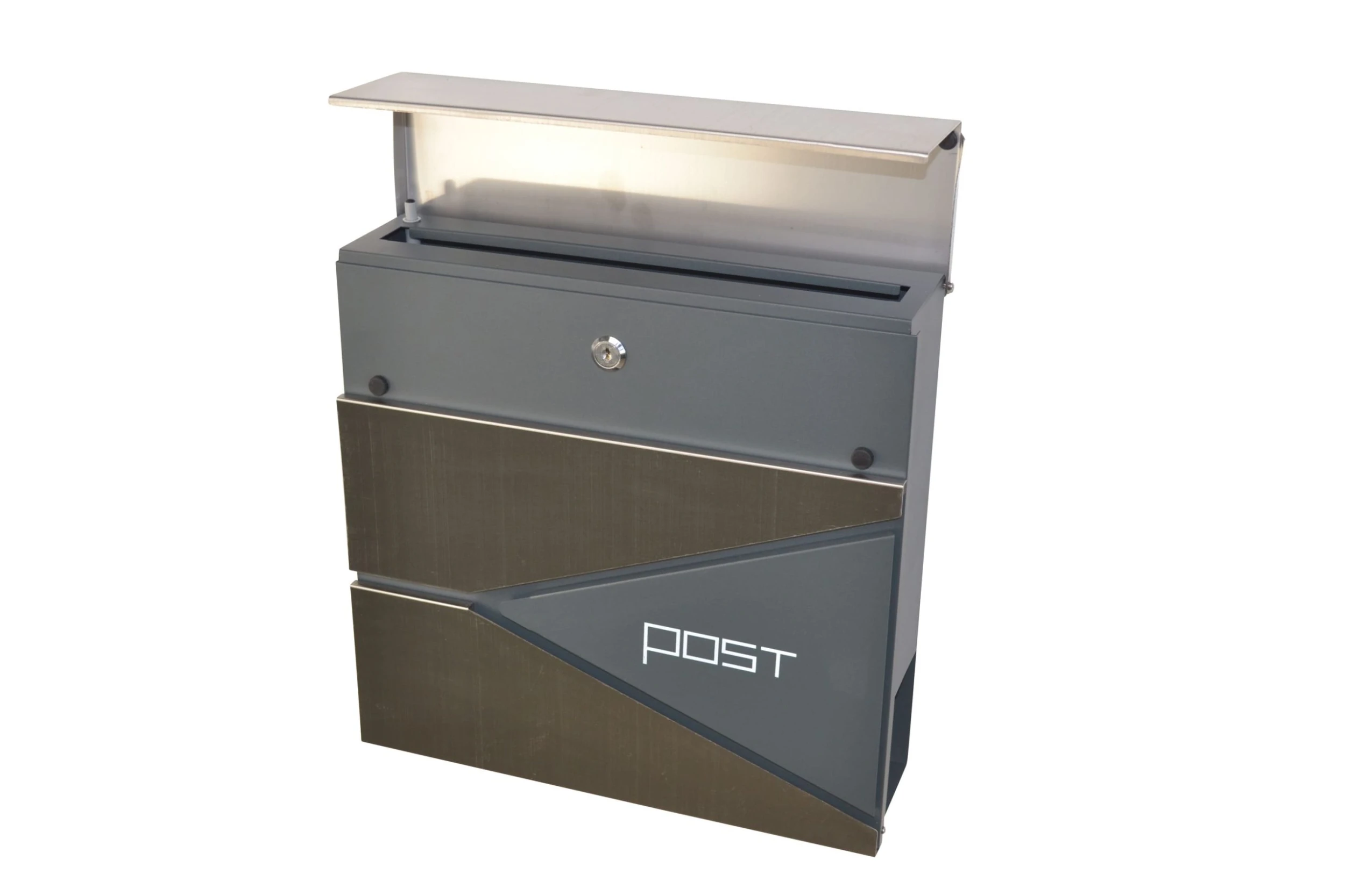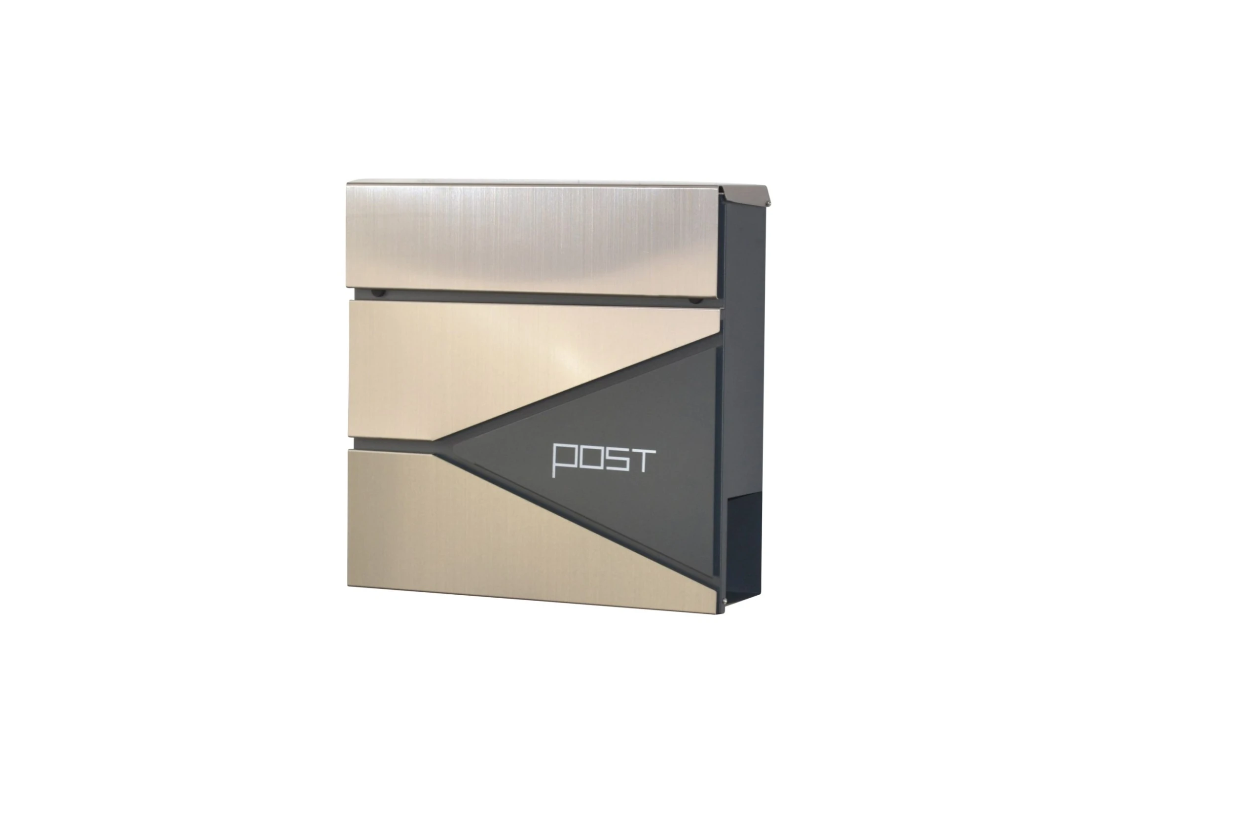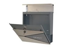 Metallbriefkasten mit einer optisch modernen Oberfläche. Klappe mit Softabsendung, darunter Briefeinwurfschlitz (ca. 33,5 x 2,8 cm groß). Front mit Aufdruck “Post”, mit Schloss (inklusive zwei Schlüssel) aufklappbar. Ganz unten praktisches Zeitungsfach. Zur Wandmontage. Maße ca. cm: (B/H/T) 37/37/11.