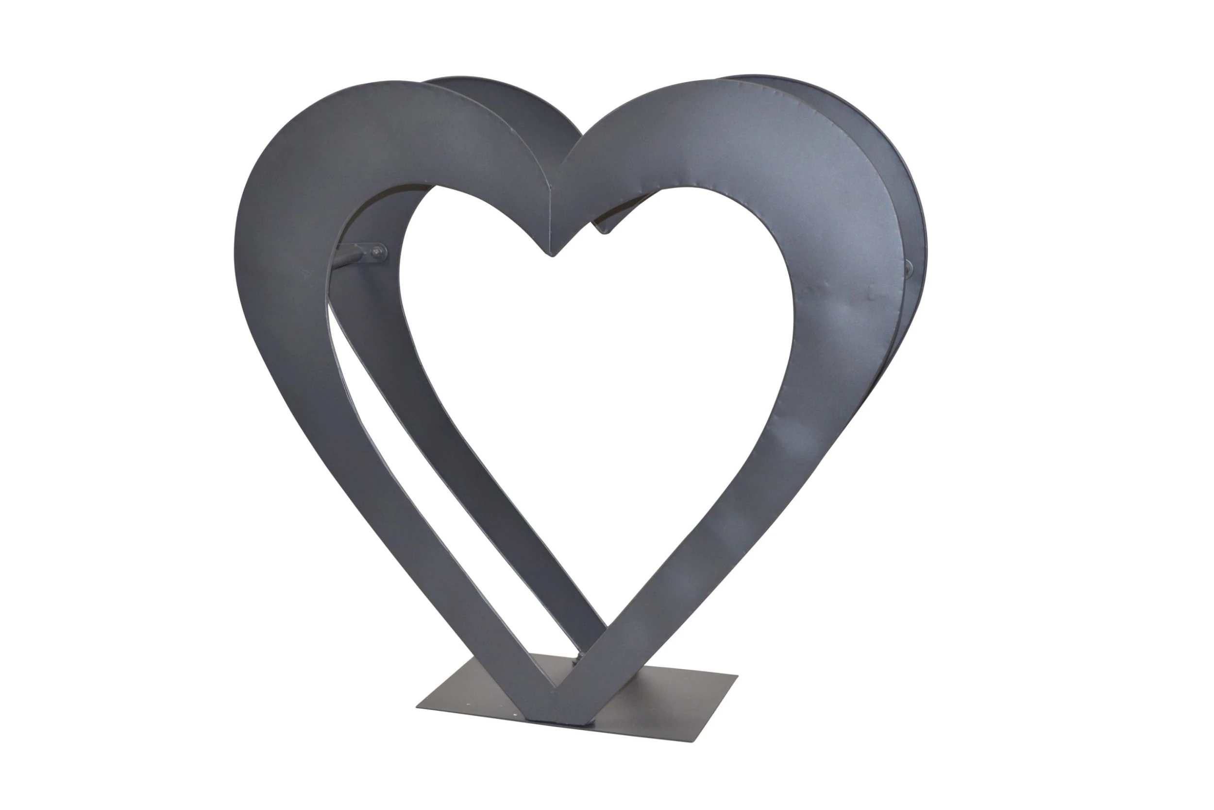 Trendiges, dekoratives Metallregal aus Eisen mit einer anthrazitfarbenen Oberfläche in Form eines großen Herzes. In der Mitte Platz für z. B. Holz oder anderes Dekoratives. Artikel ist für den Outdoorbereich aber auch für innen geeignet. Beim Nutzen im Indoorbereich bitte zum Schutz ihres Bodenbelages entsprechende Vorkehrungen treffen, damit der Boden keine Schaden nimmt. Artikel wird teilzerlegt angeliefert. Maße ca. cm.: B. 61 x T. 25 x H. 56 cm.