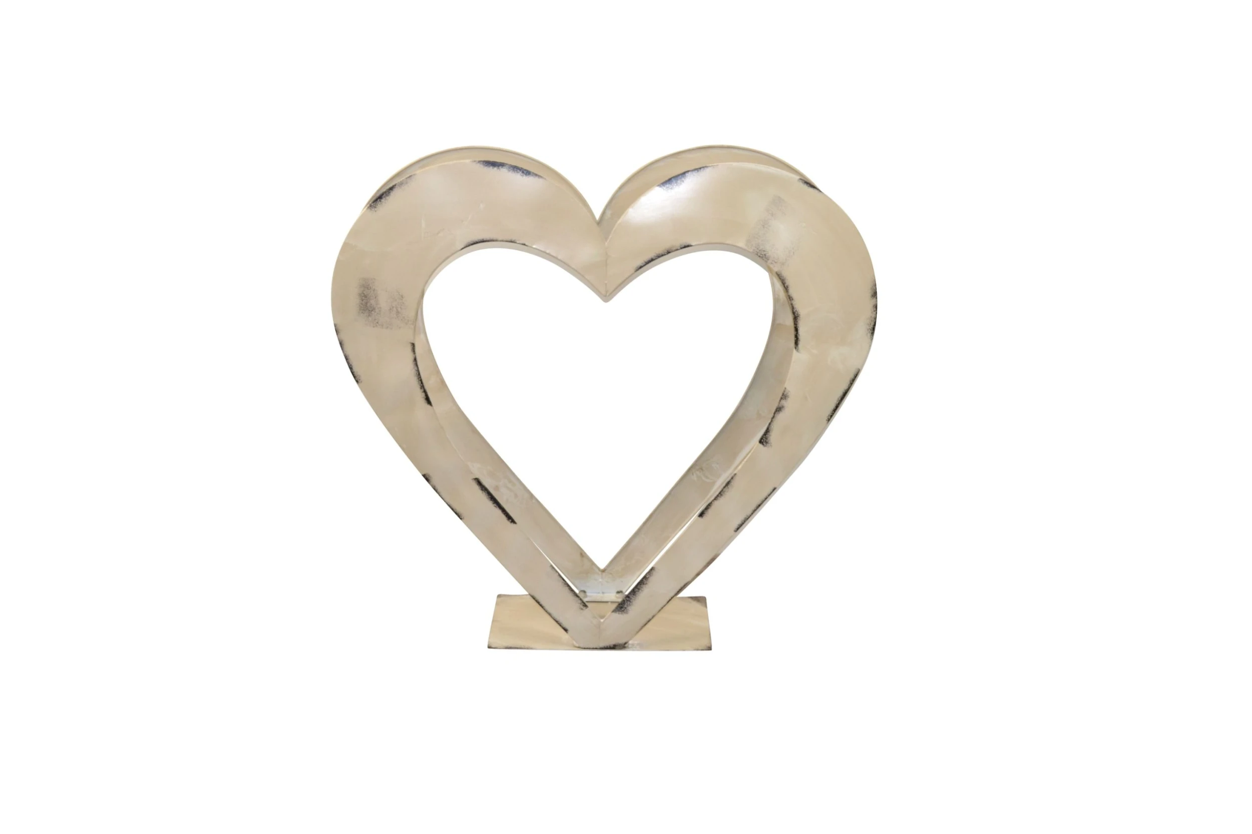 Trendiges, dekoratives Metallregal aus Eisen mit einer antik weißen, gewischten Oberfläche in Form eines großen Herzes. In der Mitte Platz für z. B. Holz oder anderes Dekoratives. Artikel ist für den Outdoorbereich aber auch für innen geeignet. Beim Nutzen im Indoorbereich bitte zum Schutz ihres Bodenbelages entsprechende Vorkehrungen treffen, damit der Boden keine Schaden nimmt. Artikel wird teilzerlegt angeliefert. Maße ca. cm.: B. 91 x T. 27 x H. 87,5 cm.