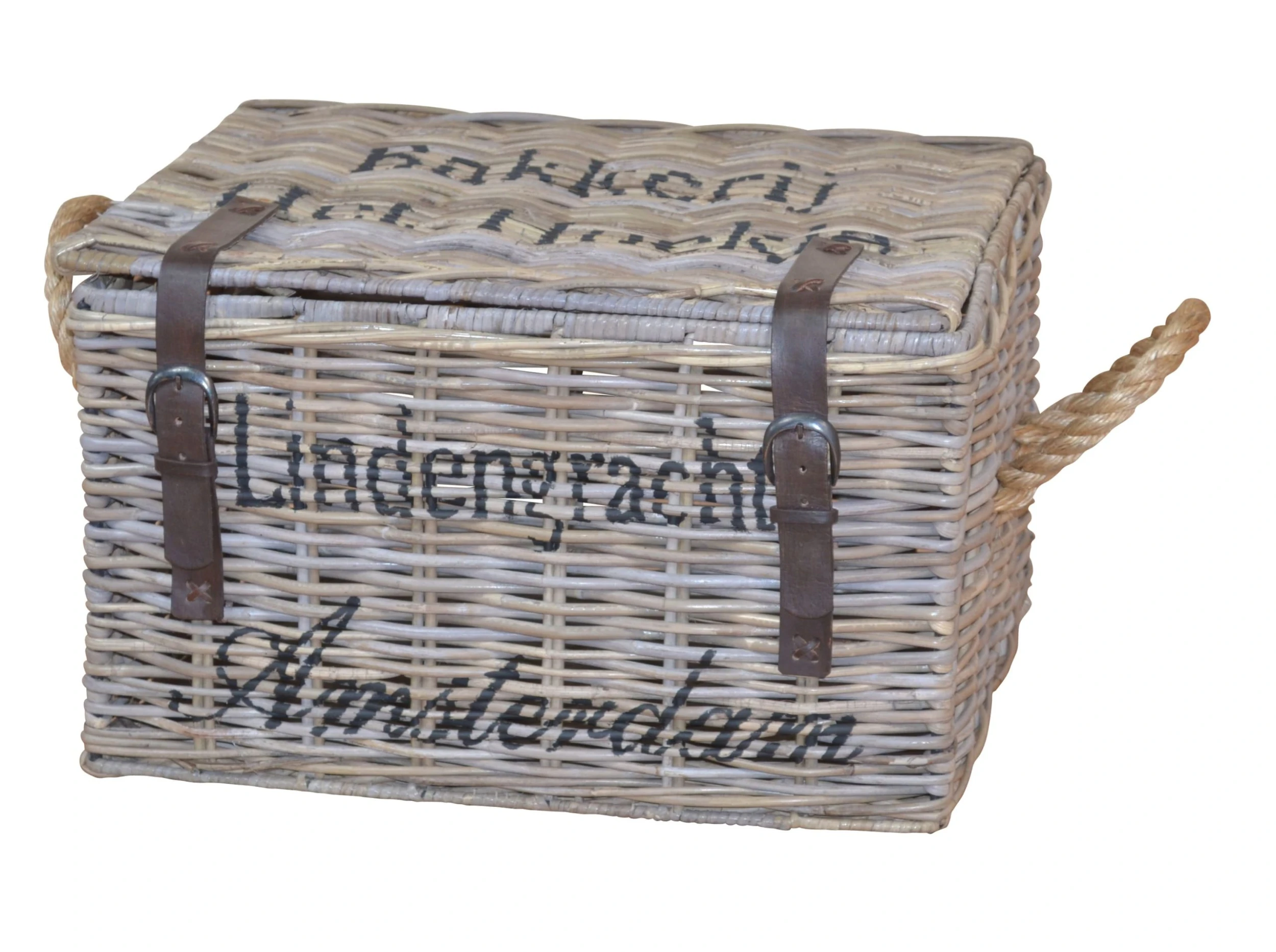 Trendige Truhe mit Kubu-Rattangeflecht, handgeflochten und naturgrau, lackiert. Rechts/links mit dekorativen, gedrehten Seilgriffen bestückt. Deckel aufklappbar, mit 2 Kunstlederschnallen (100% Polyvinylchlorid), braun, bestückt. Unter dem Deckel Stauraum. Der Deckel und die Frontseite ist mit einem trendigen Print versehen.