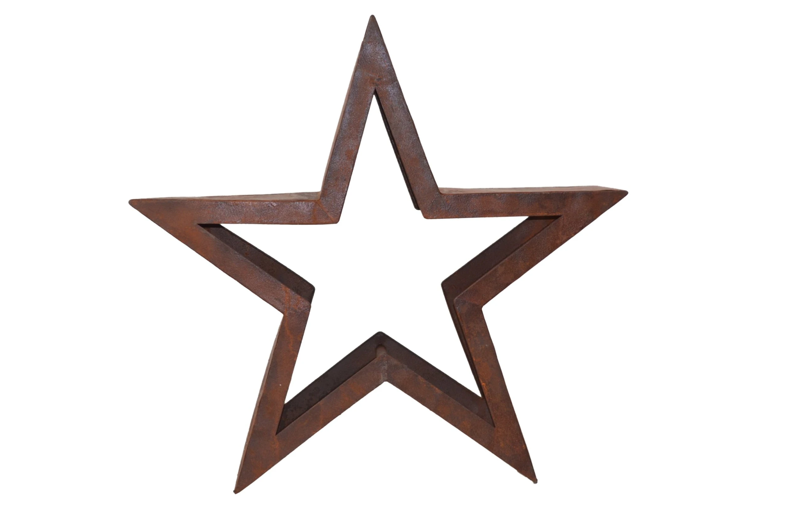 Trendige Metalldekoration aus Eisen mit einer rostigen Oberfläche, in Form eines großen Sternes. Für den Indoor- und auch Outdoorbereich dekorativ und schön. Lieferung erfolgt montiert. In der Mitte lässt sich z. B. optisch schön Holz andekorieren oder andere Dekos. Maße ca. cm: B. 106 x T. 28 x H. 101 cm.