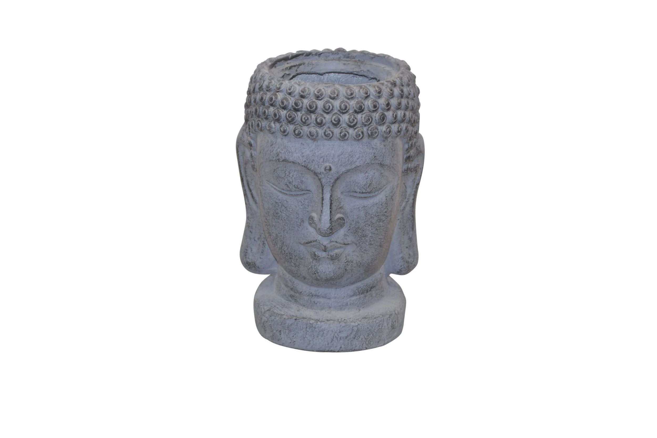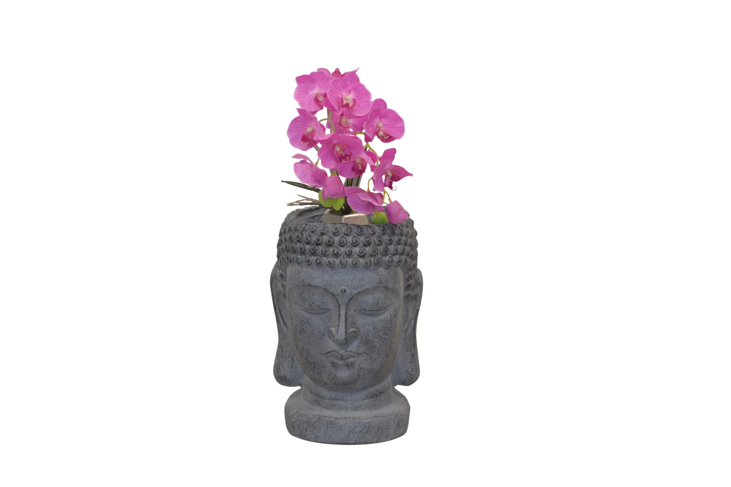 Pflanzkübel “Buddhakopf I” aus Polyresin (Magnesium-Pulver), naturgrau lackiert, mit schönen Details gearbeitet. Mit Pflanzeinsatz (Ø13 x Höhe 15 cm) gearbeitet. Gesamtmaße ca. cm: (B/H/T) 23/34/24.