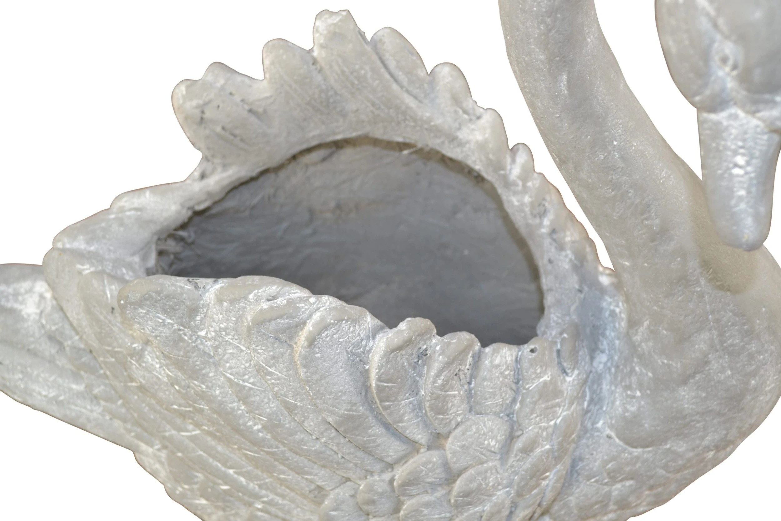 Pflanzkübel “Schwan” aus Polyresin (Magnesium-Pulver), naturgrau lackiert, mit schönen Details gearbeitet. Mit Pflanzeinsatz (Breite 18,5 x Tiefe 12 x Höhe 15 cm) gearbeitet. Gesamtmaße ca. cm: (B/H/T) 43/40/23