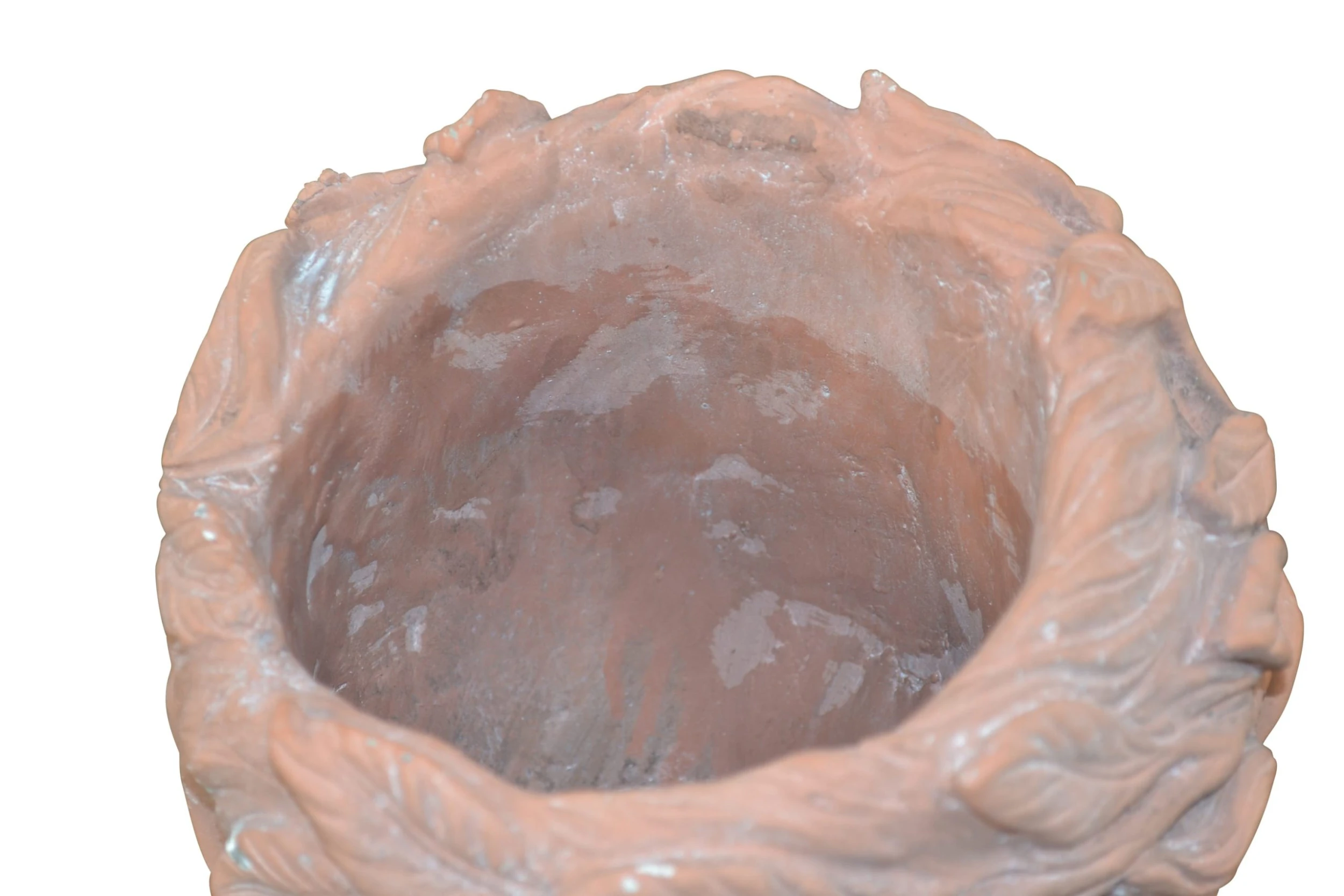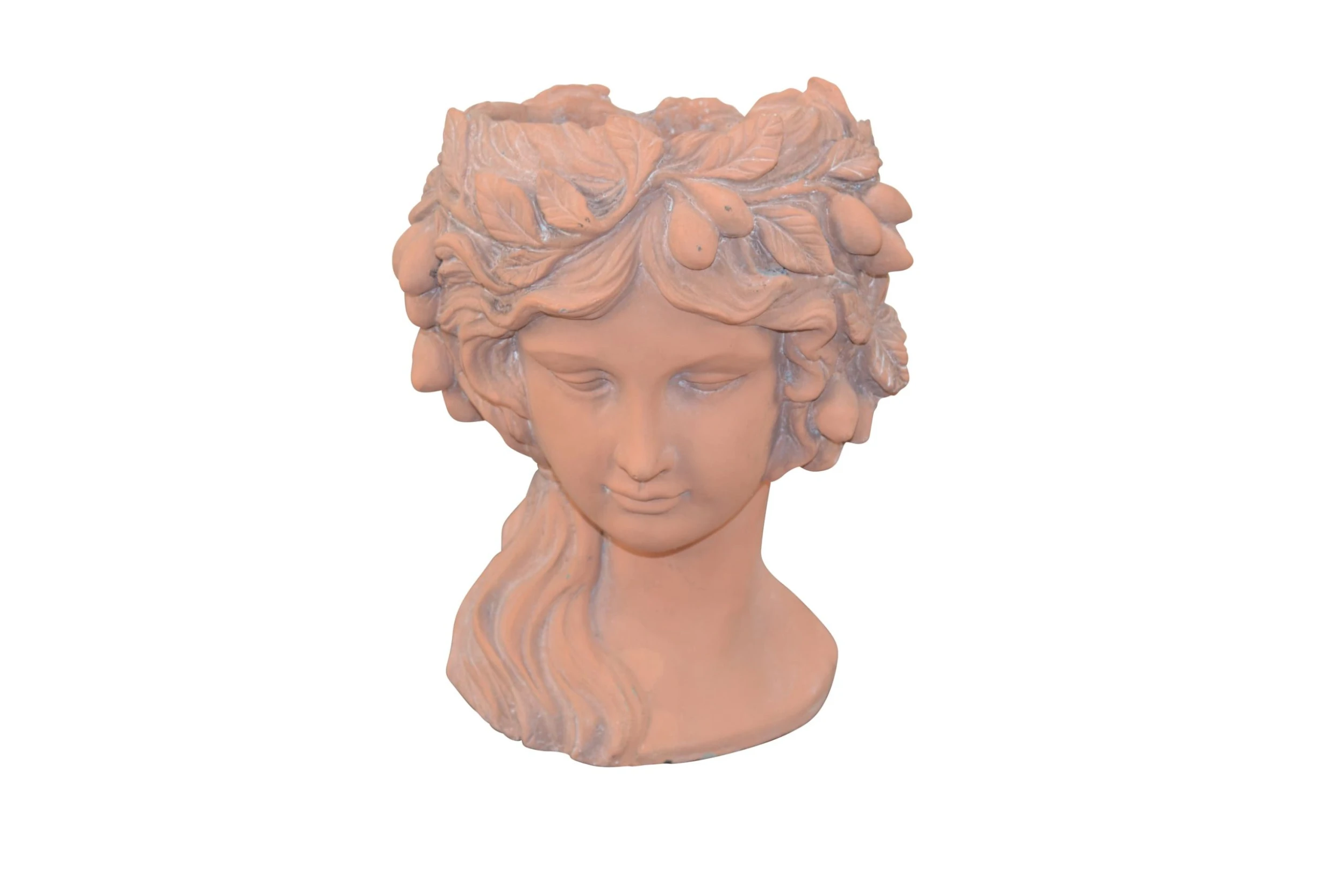 Pflanzkübel “Frauenkopf” aus Zement, terrakottafarben, mit schönen Details gearbeitet. Pflanzeinsatz ca. Ø12,5 cm x Höhe 16 cm. Gesamtmaße ca. cm: (B/H/T) 22/30/19. Gewicht ca. 6 kg.