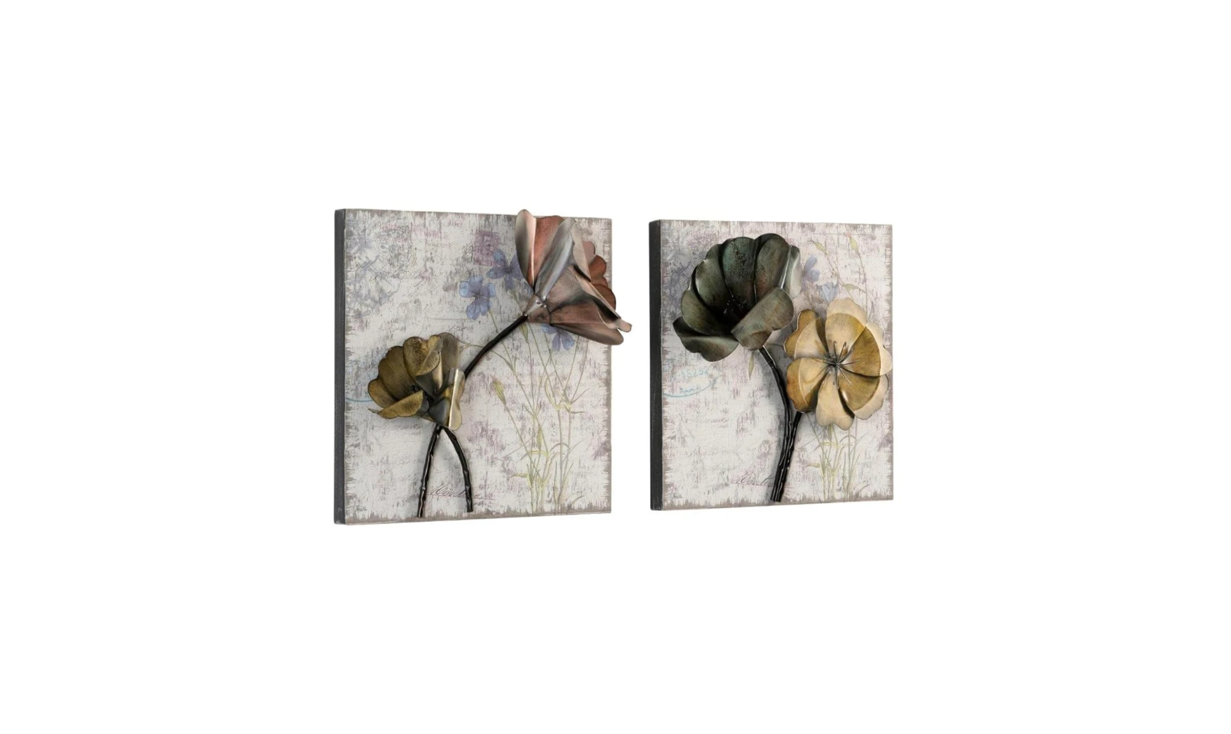 Aus Metall mit einer aufgeklebten Folie im antik-Look mit farblich aufgedruckten Motiven, zusätzlich kombiniert mit einem Metall-Blütenpaar, farbig lackiert. Zur Wandmontage. Im Lieferumfang sind 2 Wandbilder.