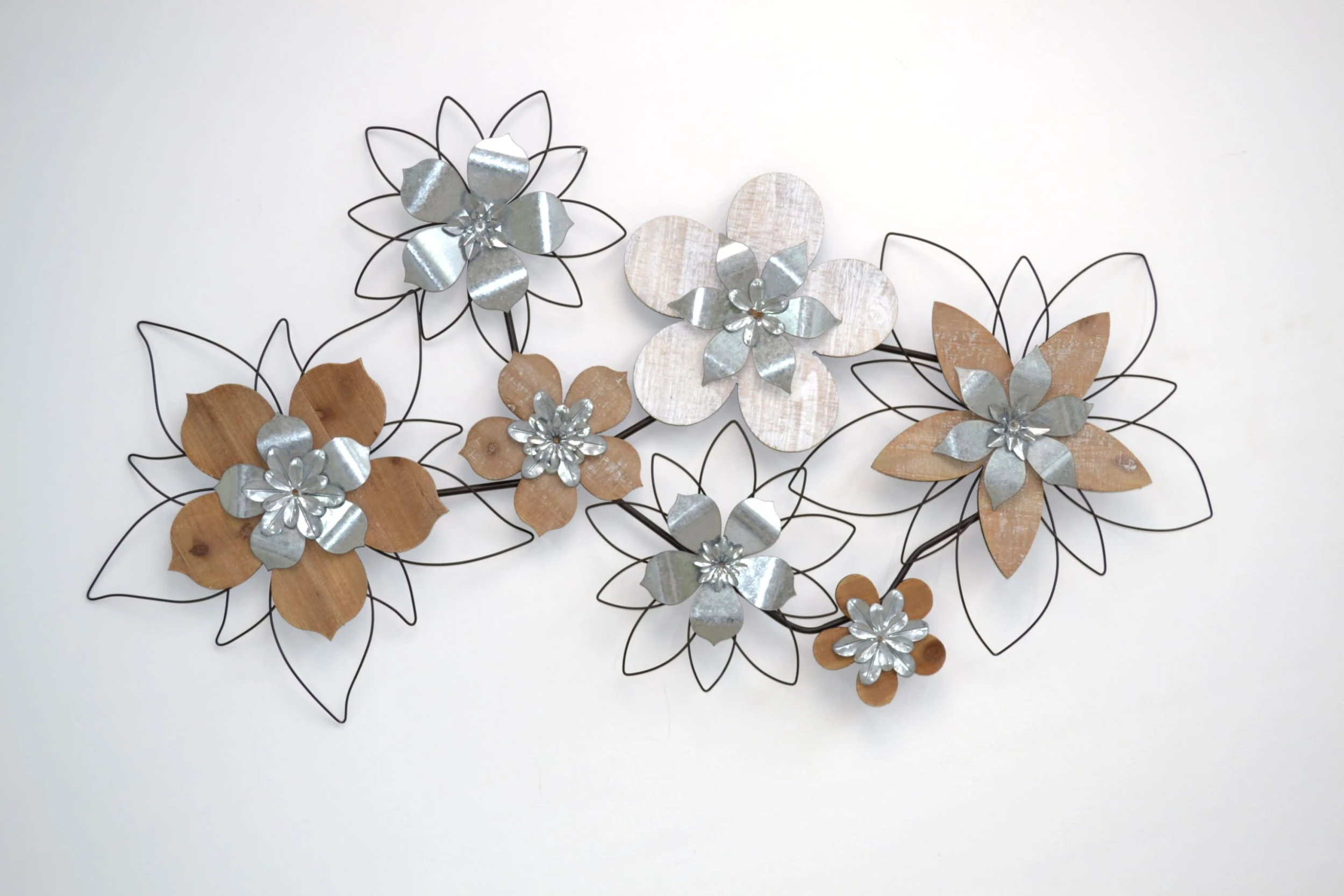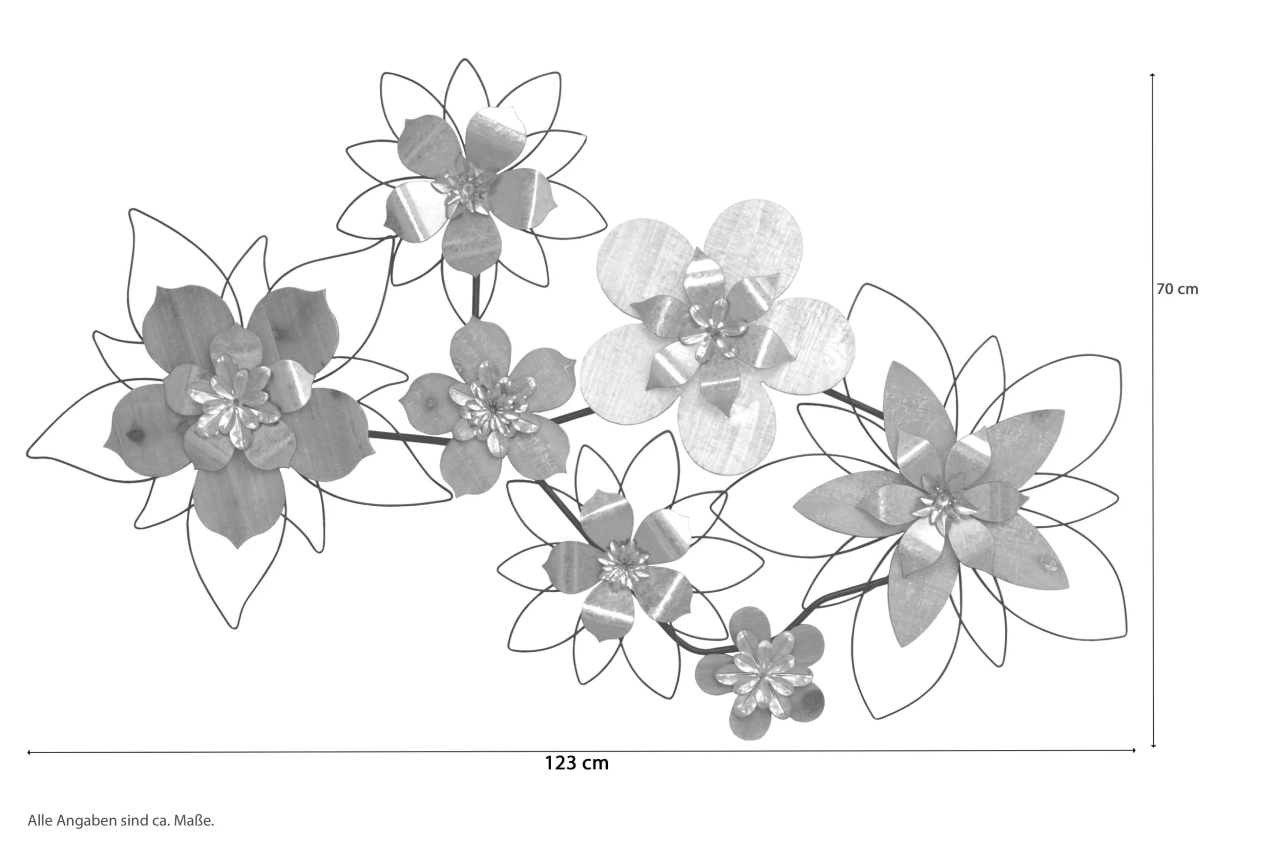 Wunderschöne Wanddekoration aus Metall, die mit vielen unterschiedlich, großen Blütenformen gearbeitet ist. Die Blütendetails sind mit Holz und Metall aufwendig herausgearbeitet und sind ein toller Blickfang im Wohnbereich. Lieferung der Wanddekoration erfolgt montiert. Maße ca. cm: (B/H/T) 123/70/5.