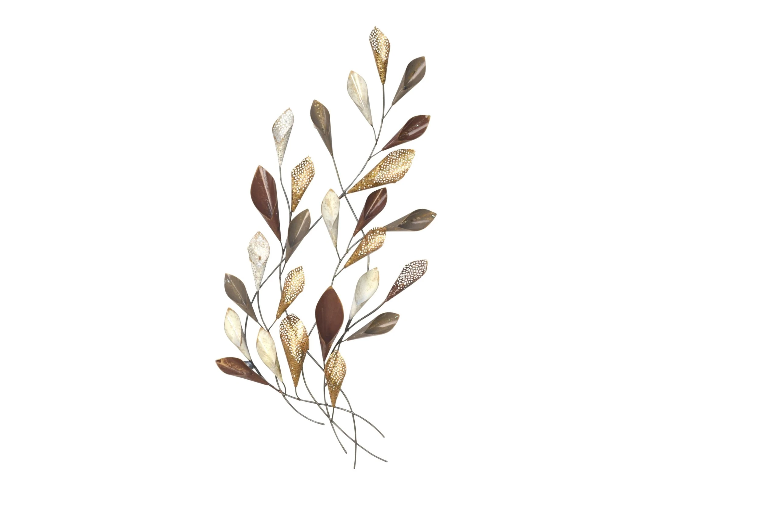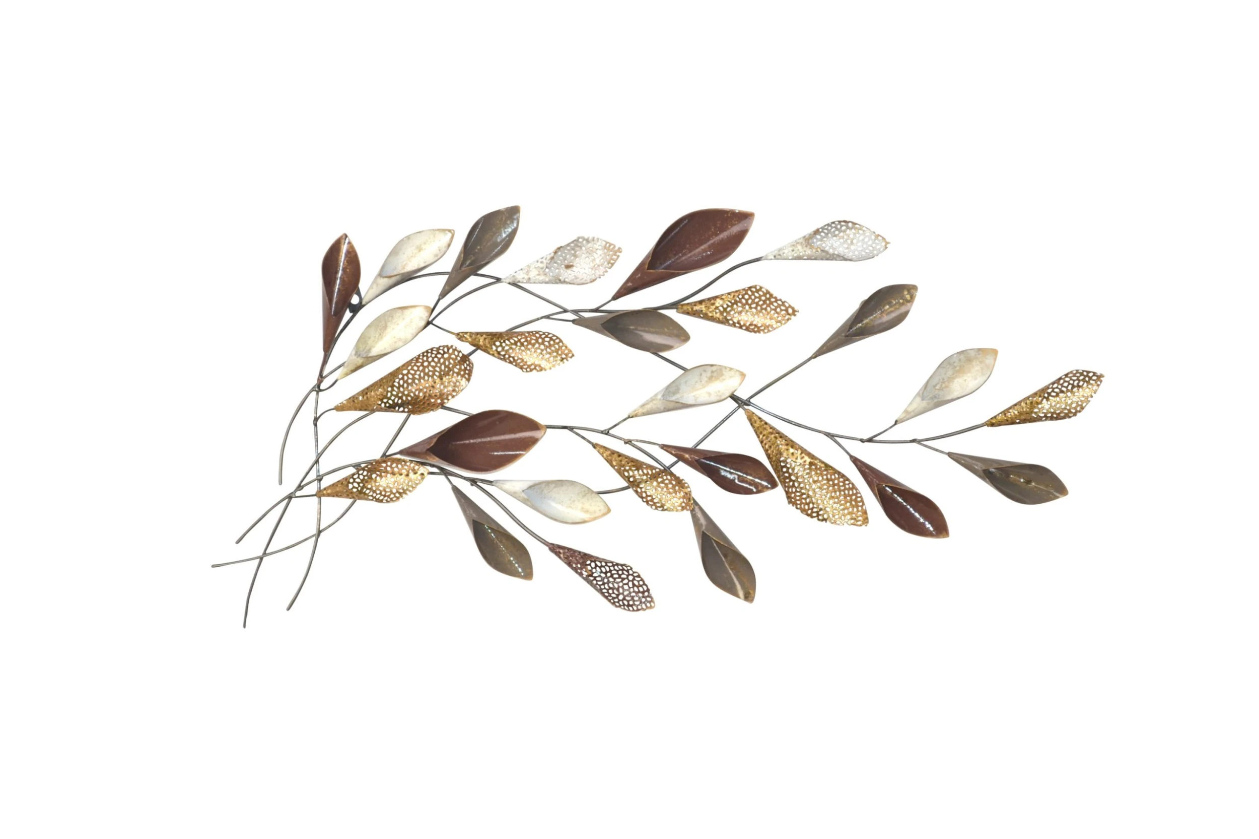 Wunderschöne Wanddekoration aus Metall mit einer Vielzahl an Blättern gearbeitet, die alle farblich unterschiedlich in braun, cremweiß, grau und goldfarben lackiert sind. Montierbar ist diese schöne Dekoration wahlweise quer oder hochkant aufhängbar. Maße ca. cm: (B/H/T) 46/87,6/6. Diese schöne Dekoration lässt sich im gesamten Wohnbereich kombinieren.